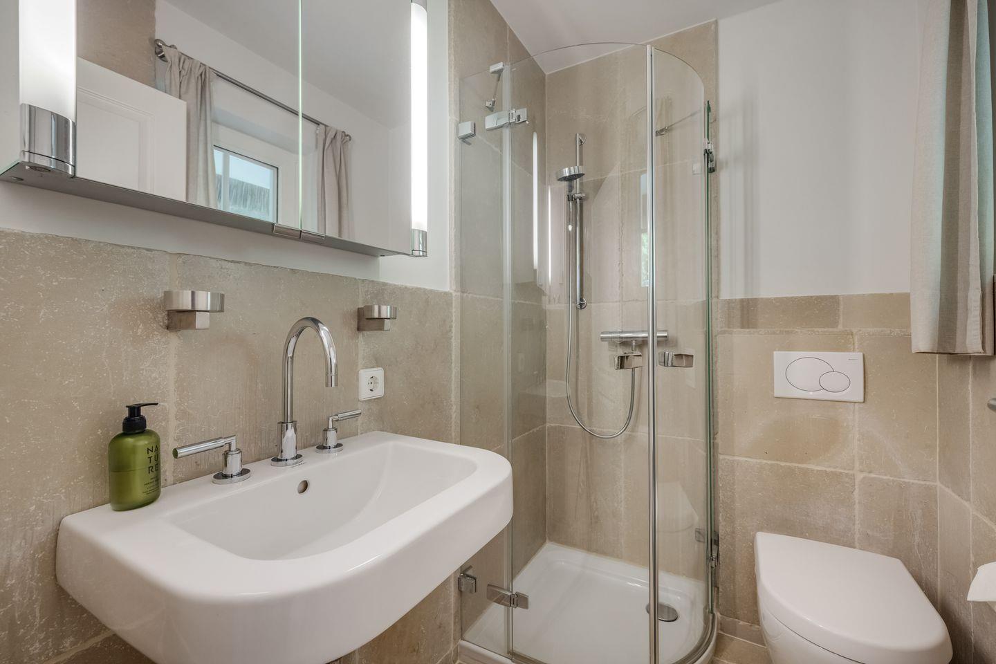 Bad 1: helles, modernes Duschbad mit elektrischem Handtuchhalter und Fußbodenheizung sowie Abstellbereich mit Waschmaschine und Trockner