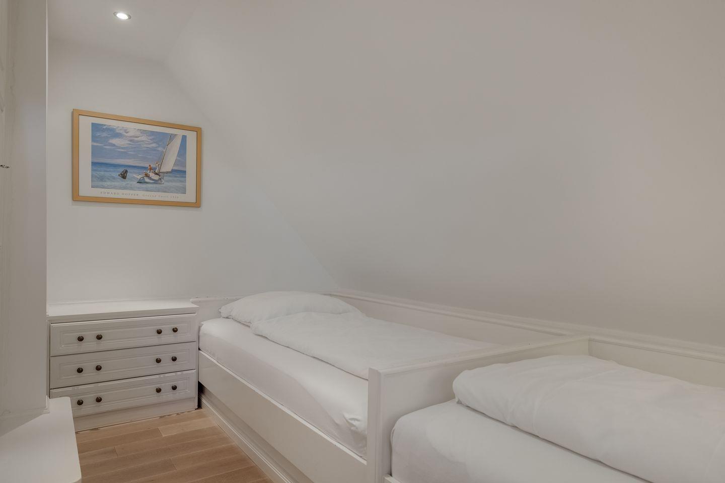 Schlafraum mit zwei Einzelbetten hintereinander und Einbauschrank
