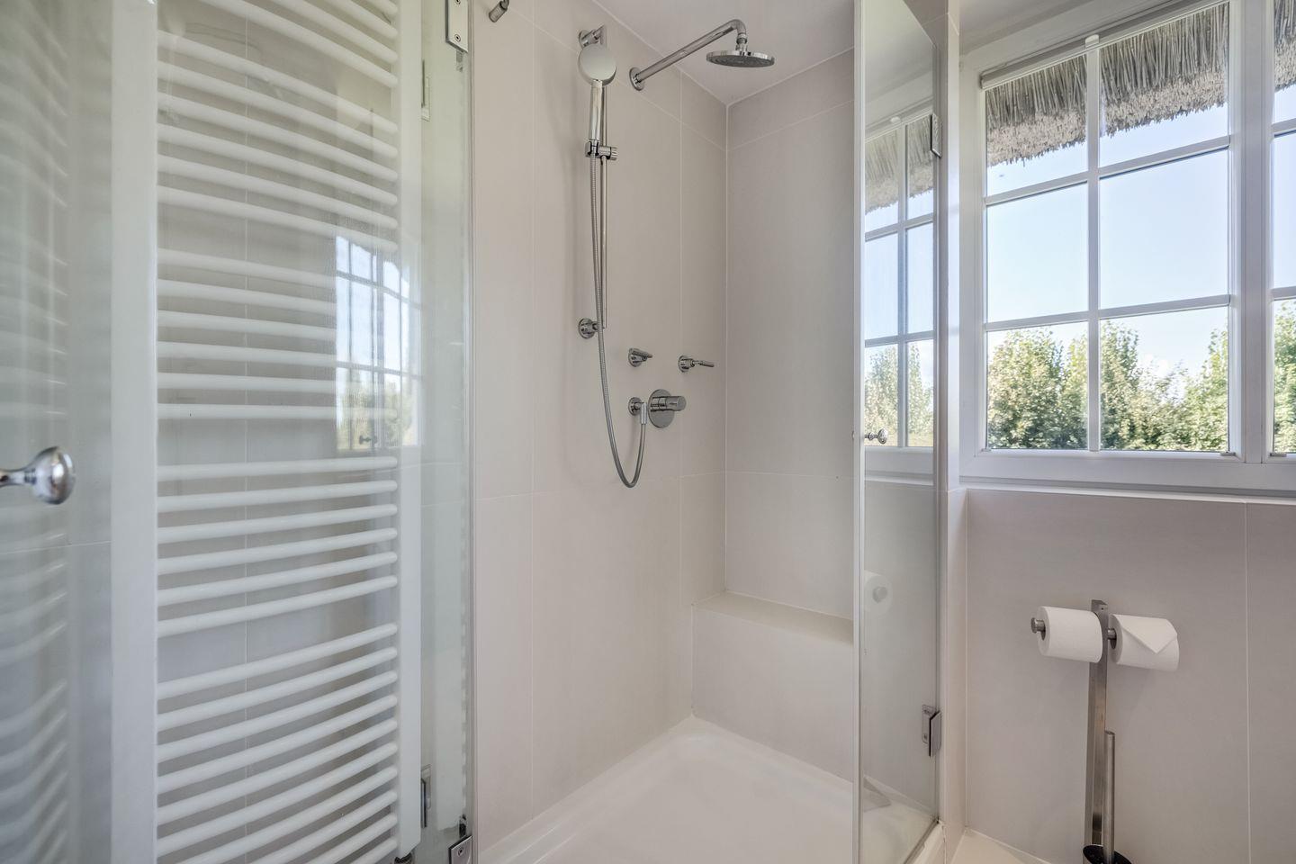 Bad 2: helle, modernes Badezimmer mit Dusche, großem Spiegel und elektrischem Handtuchwärmer