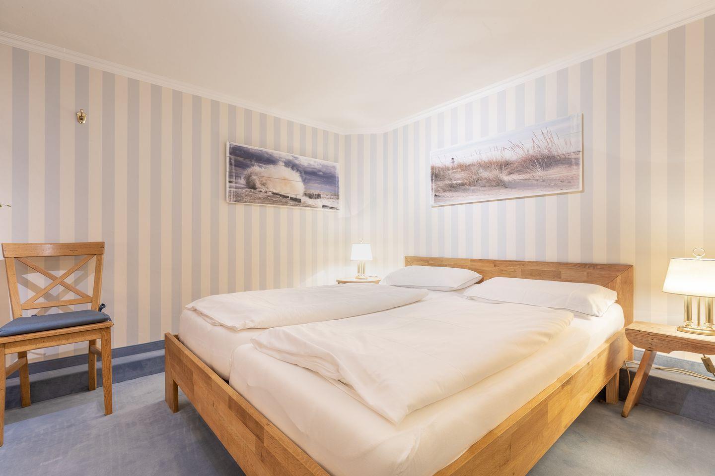 Schlafen 1: Schlafraum mit Doppelbett (2 Matratzen á 80 x 200 cm), geräumiger Einbauschrank und zwei Holz-Kommoden