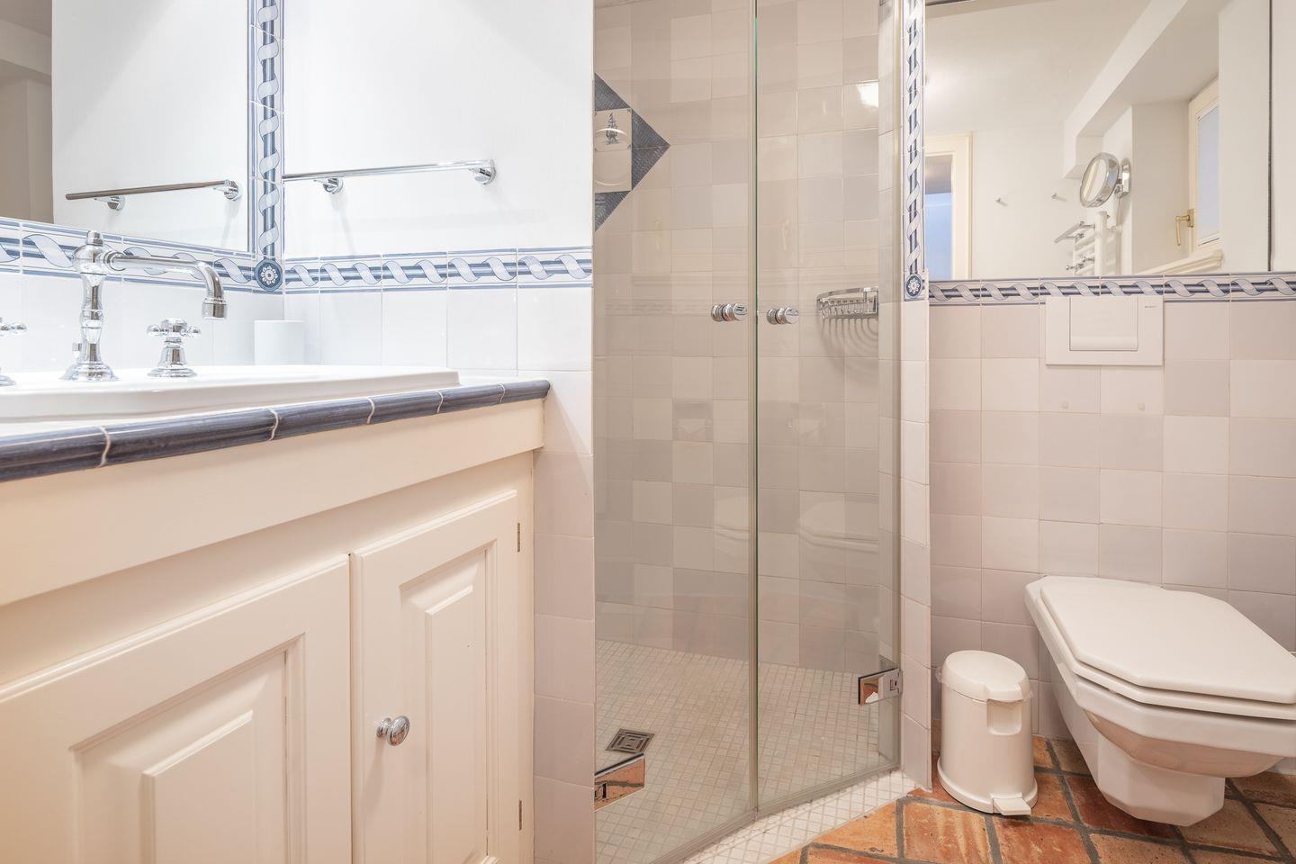 Bad 1: Dusche mit zusätzlichem Regenduschkopf, WC in weiß, Delfter-Fliesen, Fußbodenheizung, beheizter Handtuchtrockner, beleuchteter Kosmetikspiegel