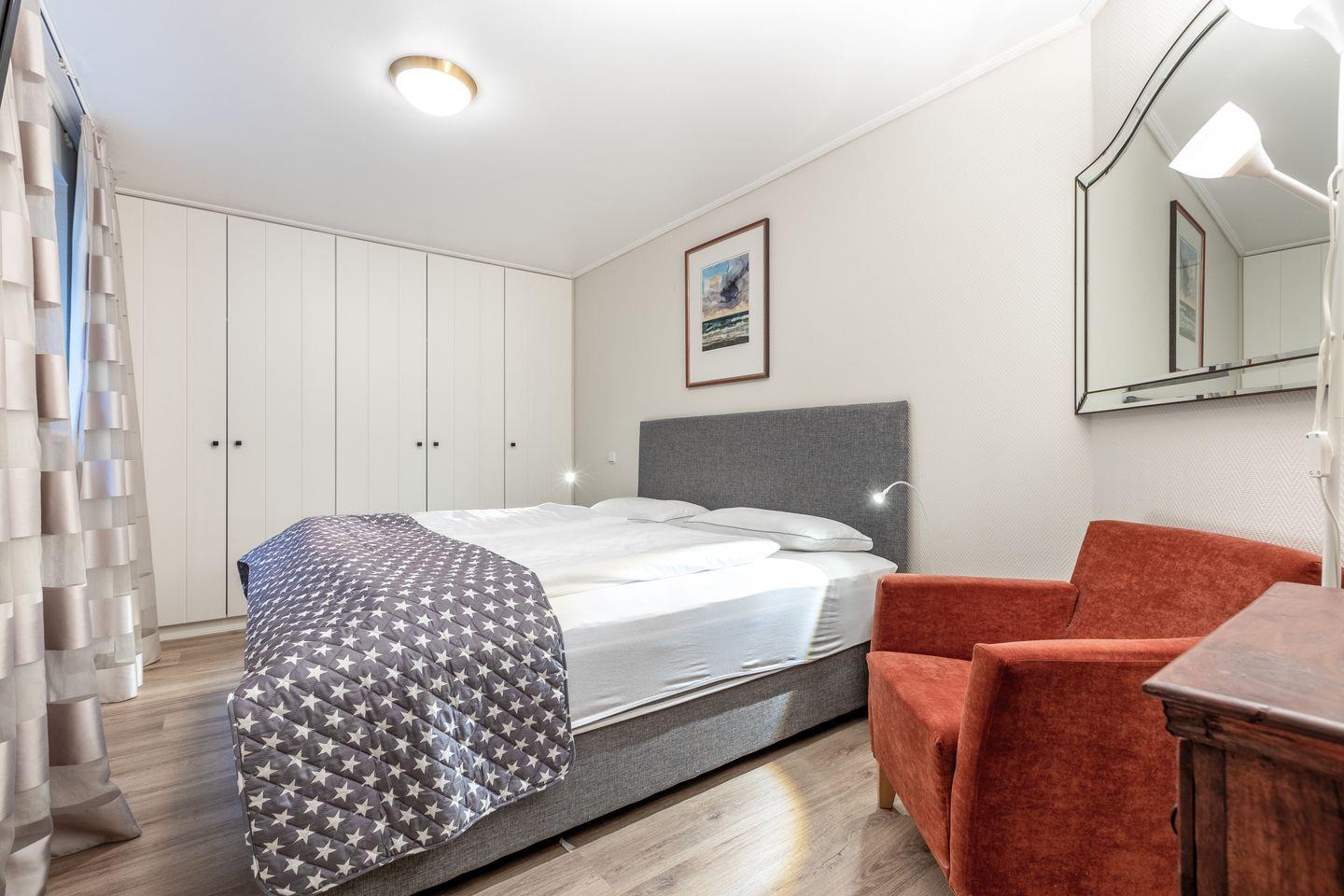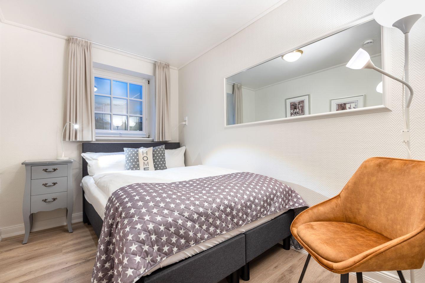 Schlafen 2: Schlafraum mit französischem Bett (140x200), kleinem Einbauschrank und Sitzgelegenheit