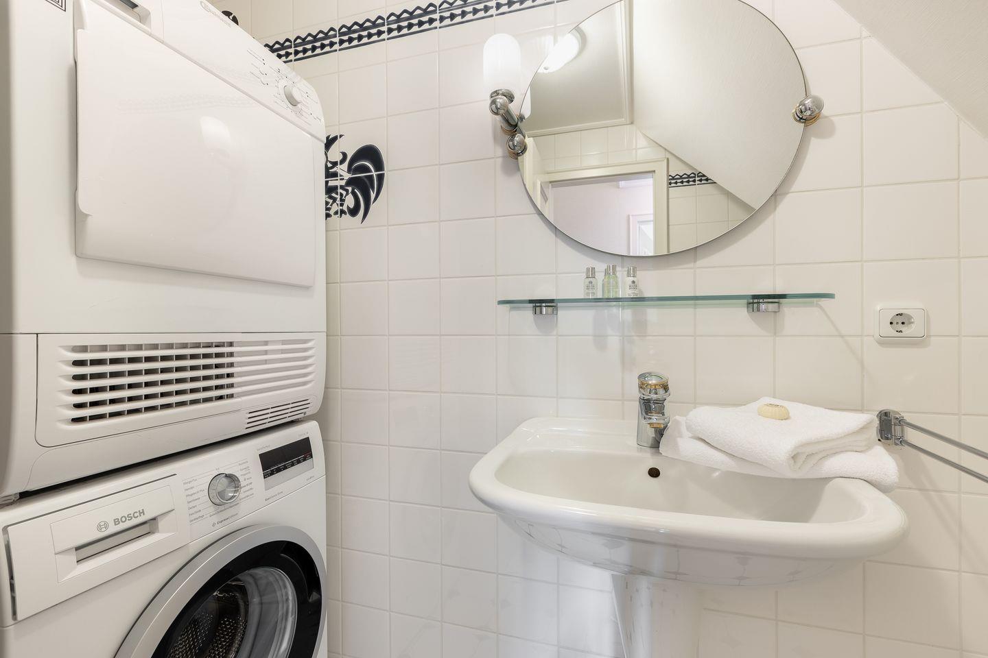 Bad 3: weißes Badezimmer mit Dusche, WC, Waschmaschine und Trockner