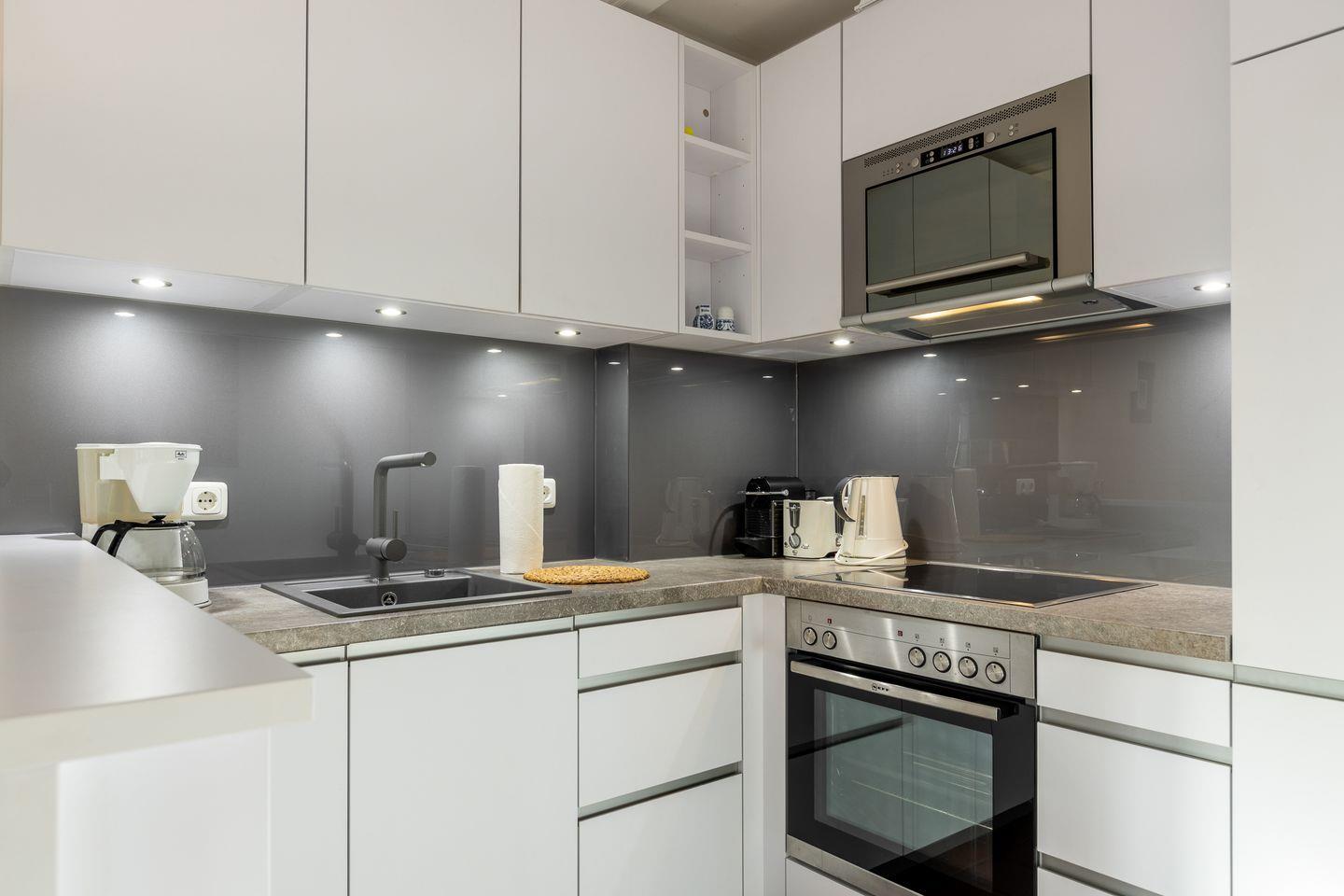 Küche: offene, moderne neue Küche mit Geschirrspüler, Mikrowelle, Backofen etc.