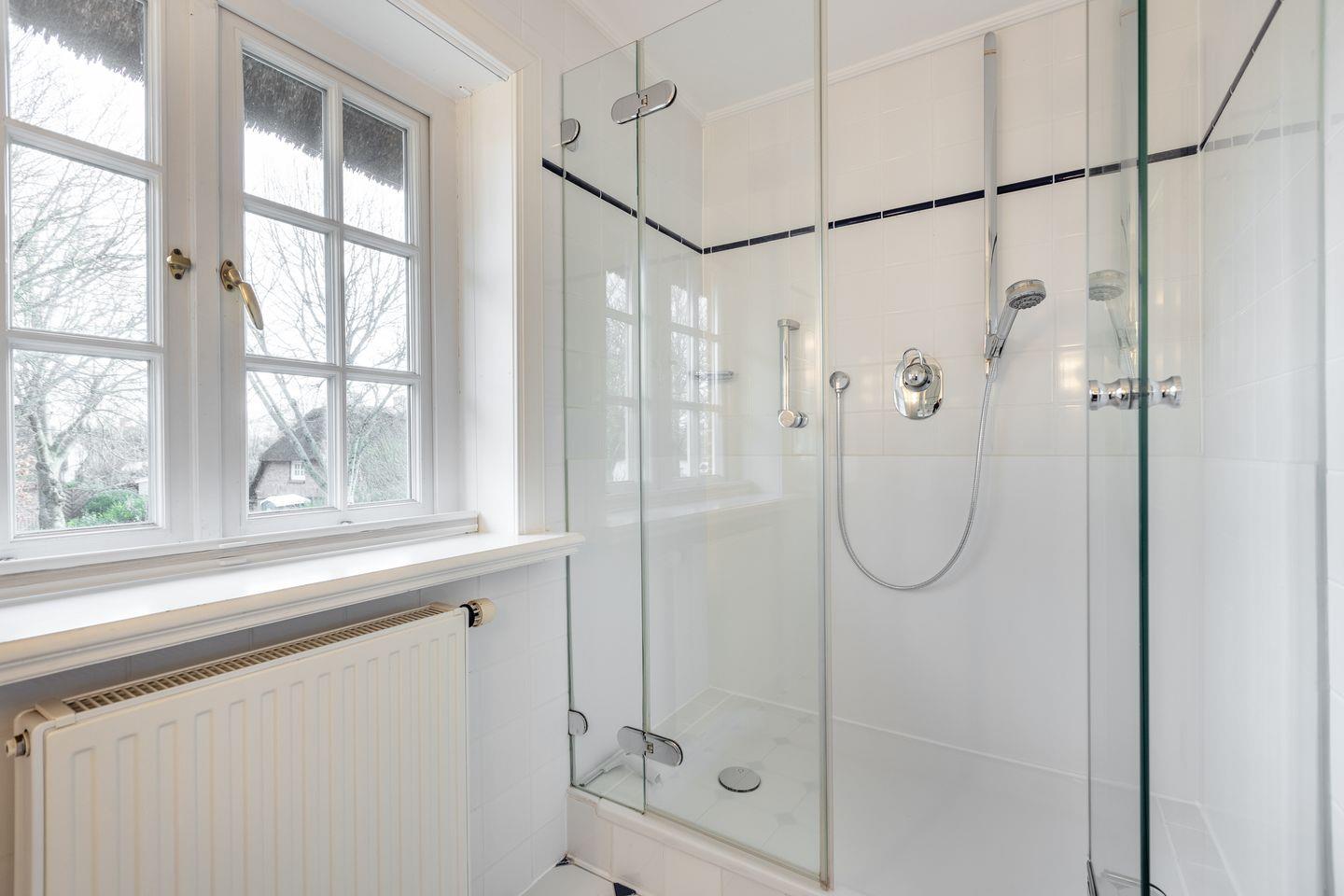 Bad 2: weißes Badezimmer mit Dusche, Kosmetikspiegel und Fön