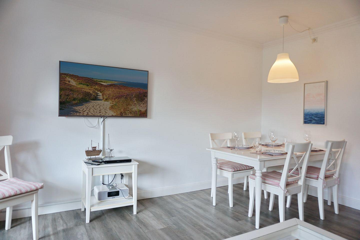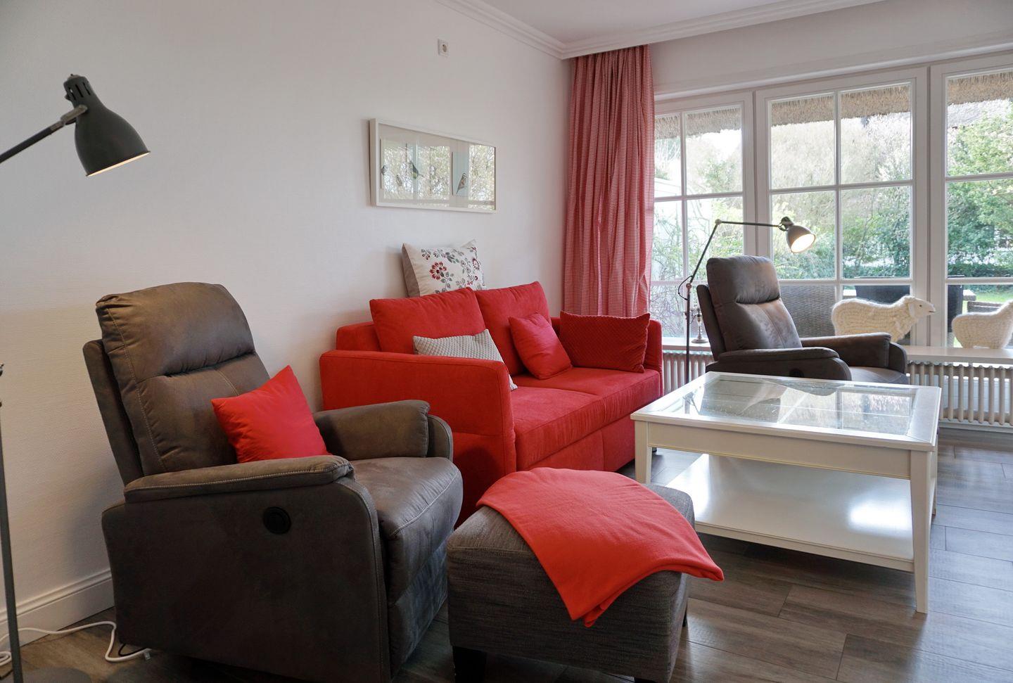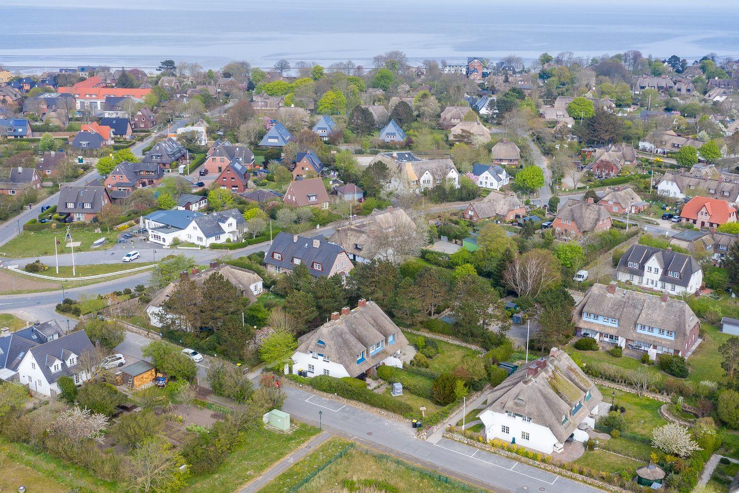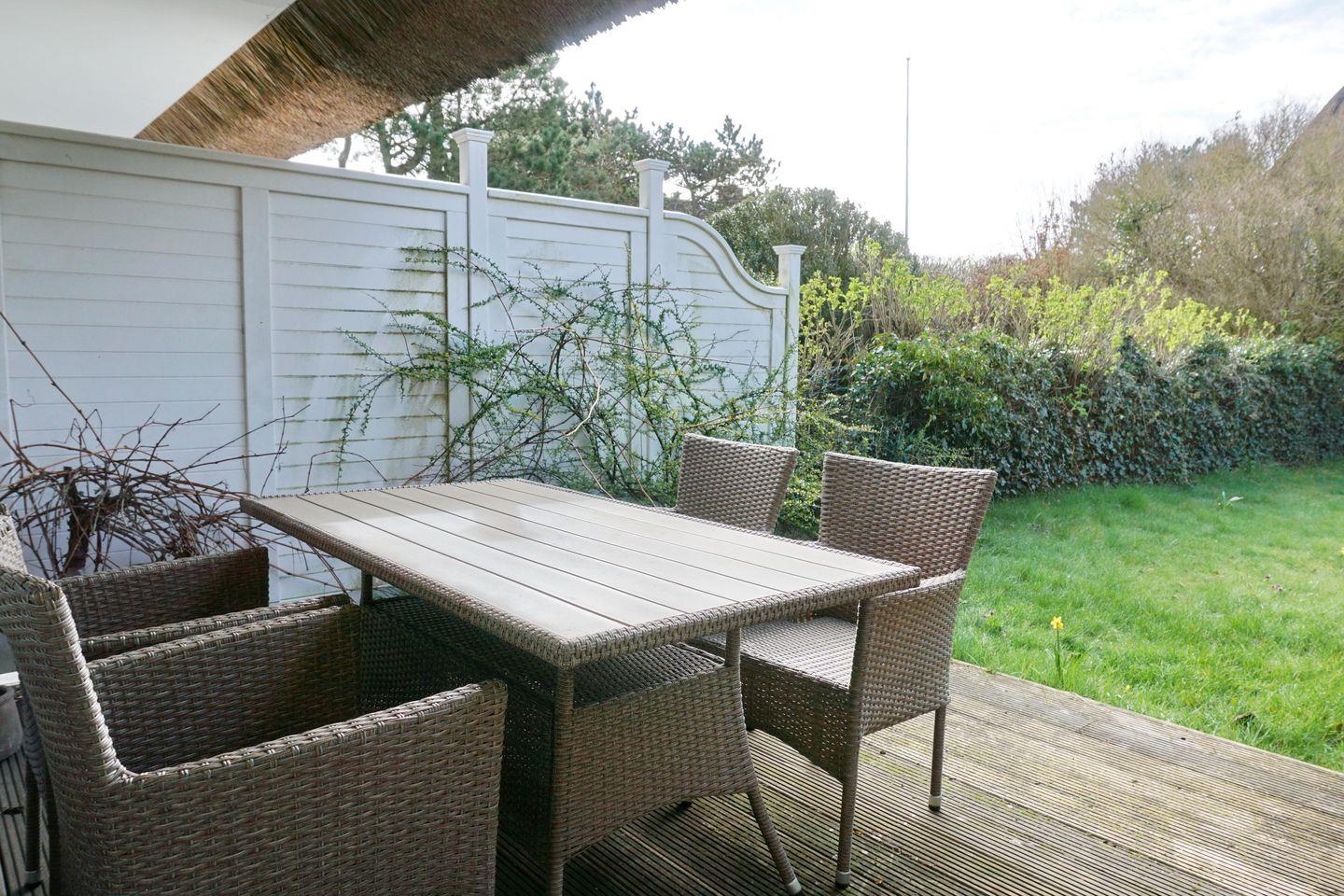 Das Mittelhausteil (Erdgeschoss, Obergeschoss und Dachgeschoss) ist ca. 79 m² groß und bietet einer Familie mit zwei bis vier Personen Platz. Das reetgedeckte, gepflegte Haus wurde aufwendig renoviert und liegt am Anfang einer Sackgasse am Ortseingang von Keitum. Die Einrichtung ist modern und gemütlich zugleich. Das Haus verfügt über Komfort wie Sauna, Telefon, W-LAN, Flat-TV, Radio mit iPod Station, Blu-Ray-Player, Cerankochfeld, Backofen, Geschirrspüler ( 45er), Waschtrockner. Selbstverständlich gehört zum Haus auch ein PKW-Stellplatz.