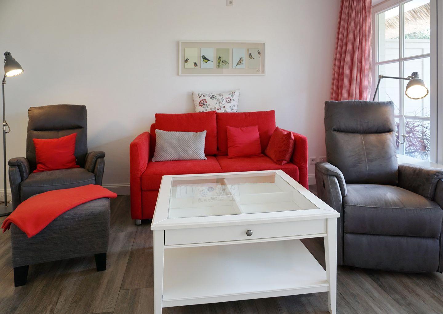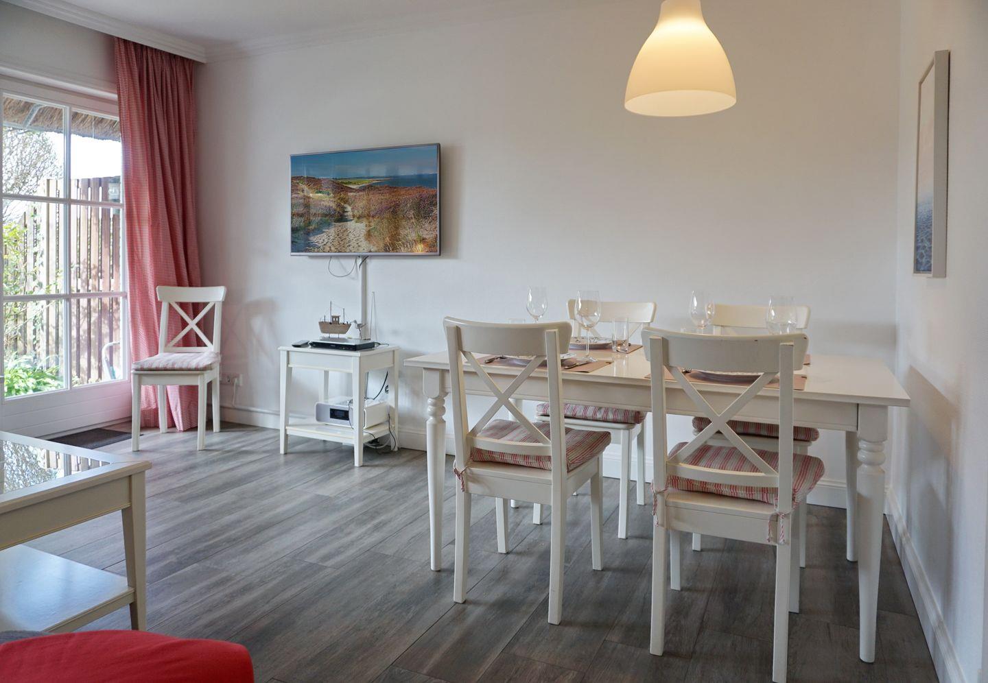 Wohn-/Essbereich: heller Raum mit 2-er Couch und zwei Sesseln mit Fußhocker; großzügiger Esstisch mit Stühlen