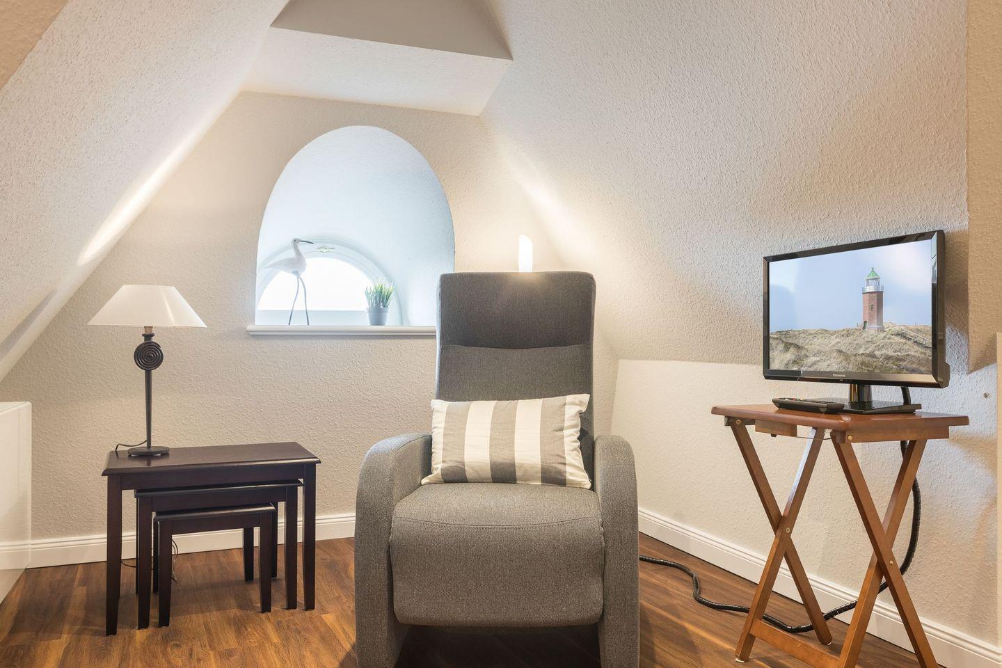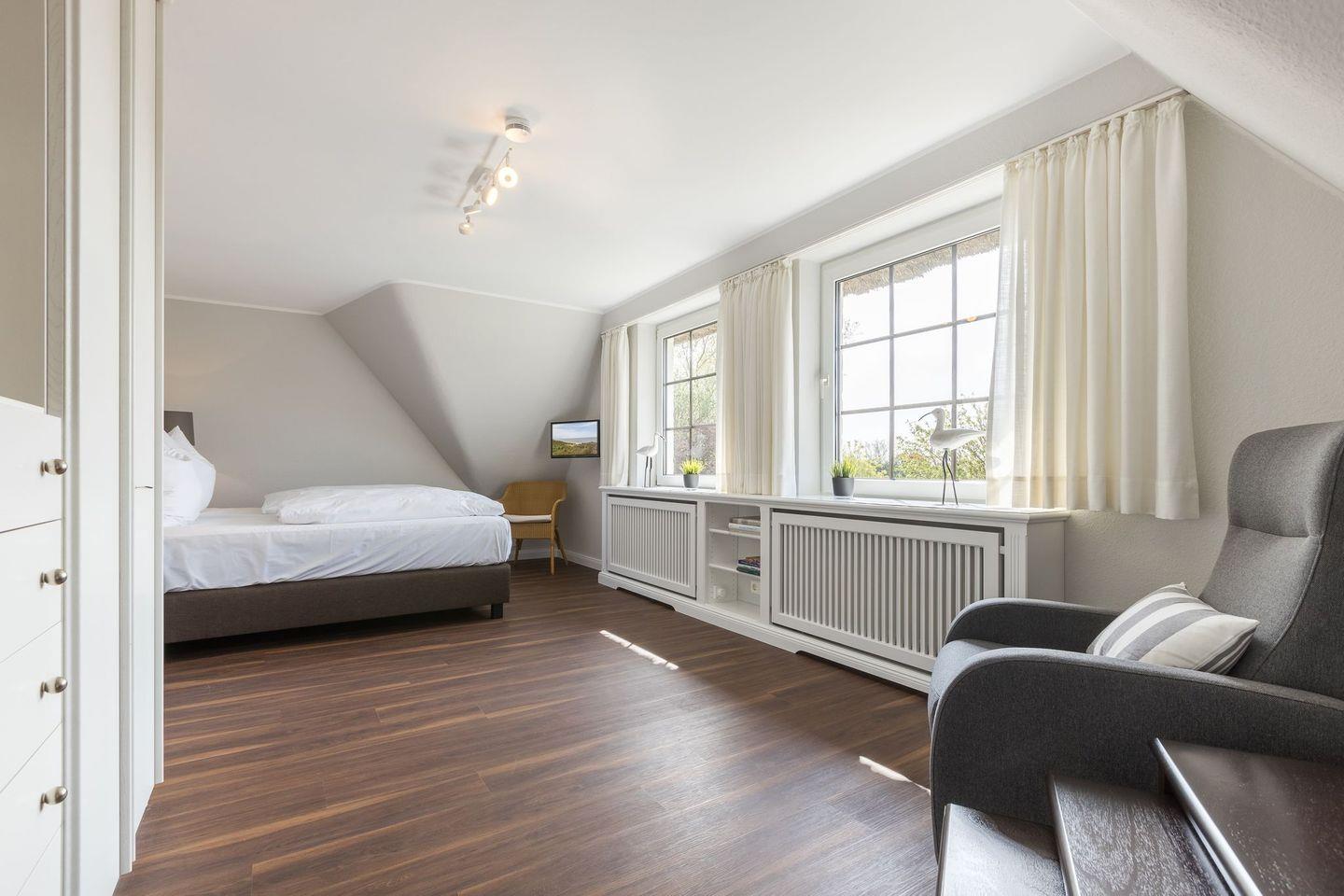Schlafen 3: Raum mit Doppelbett und gemütlicher Sitzecke sowie TV