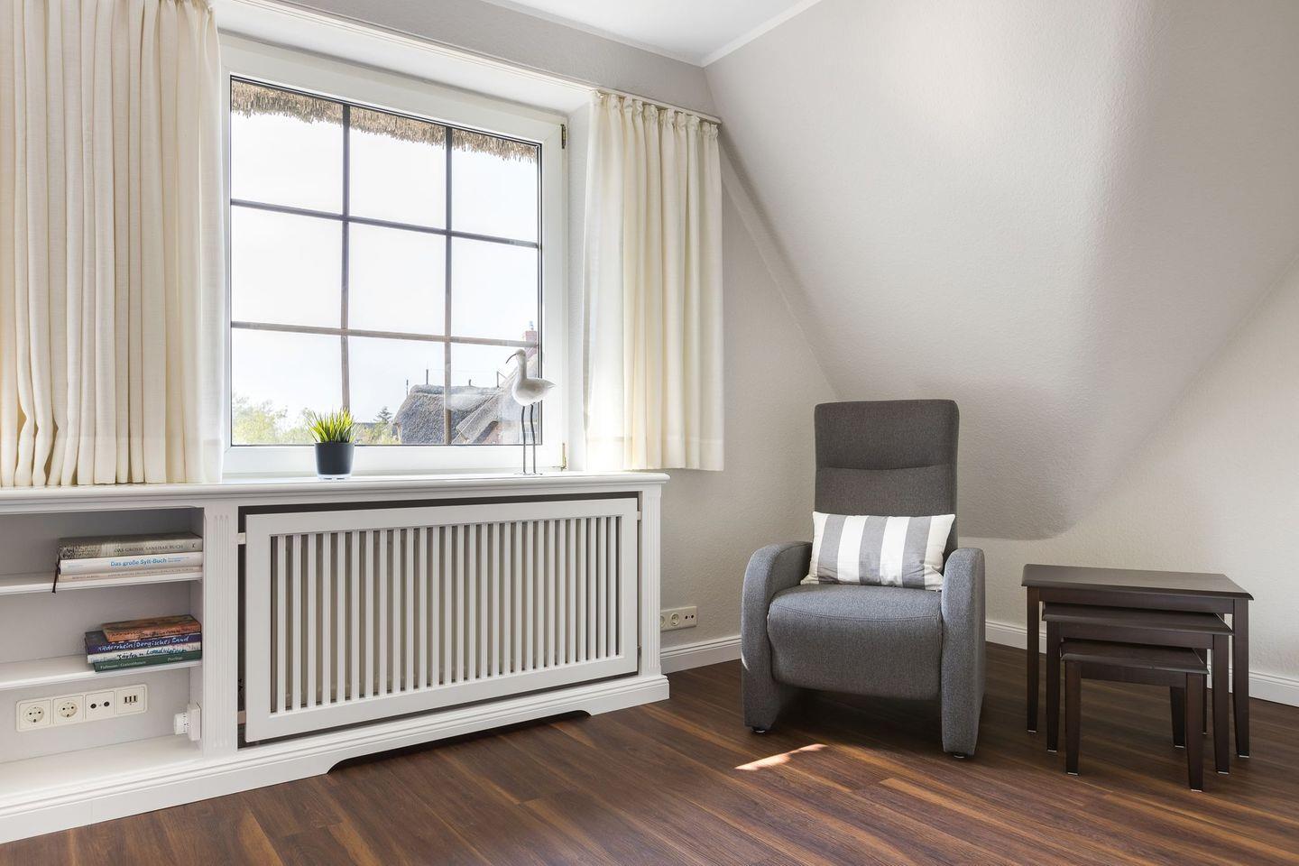Das hier vorgestellte Mittelhausteil über 3 Ebenen (Erdgeschoss, Obergeschoss und Dachgeschoss) ist ca. 120 m² groß und bietet zwei bis sechs Personen Platz. Das reetgedeckte Haus, mit seiner hochwertigen Einrichtung, liegt am Ende eines Privatweges im Osten von Keitum (Nähe Reitstall Grünhof und Bahn). Sie finden hier vollen Komfort: Ofen, Flat-TV, W-LAN, Telefon, Safe, Backofen, Cerankochfeld, Geschirrspüler, Waschtrockner und natürlich einen Pkw-Stellplatz.