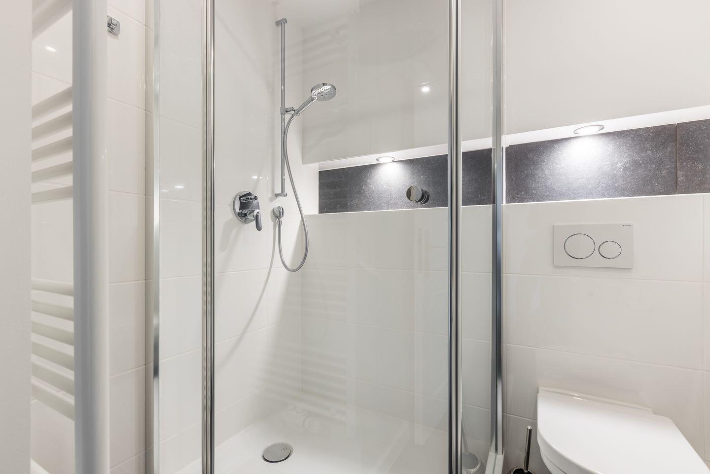 Bad: weißes Duschbad mit Runddusche / WC und elektrischem Handtuchwärmer