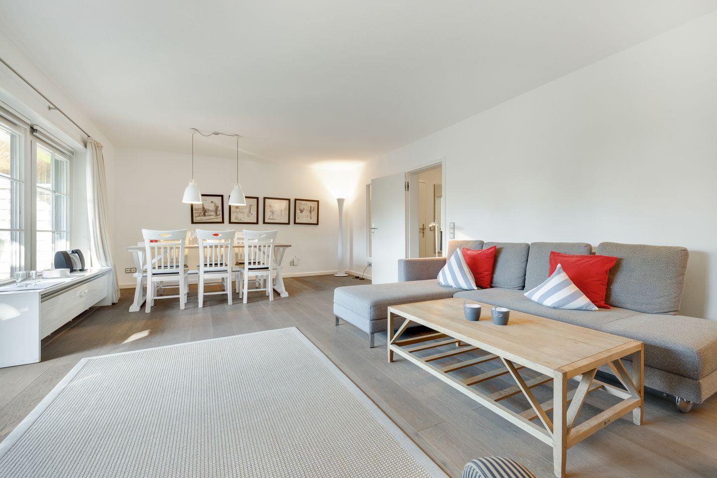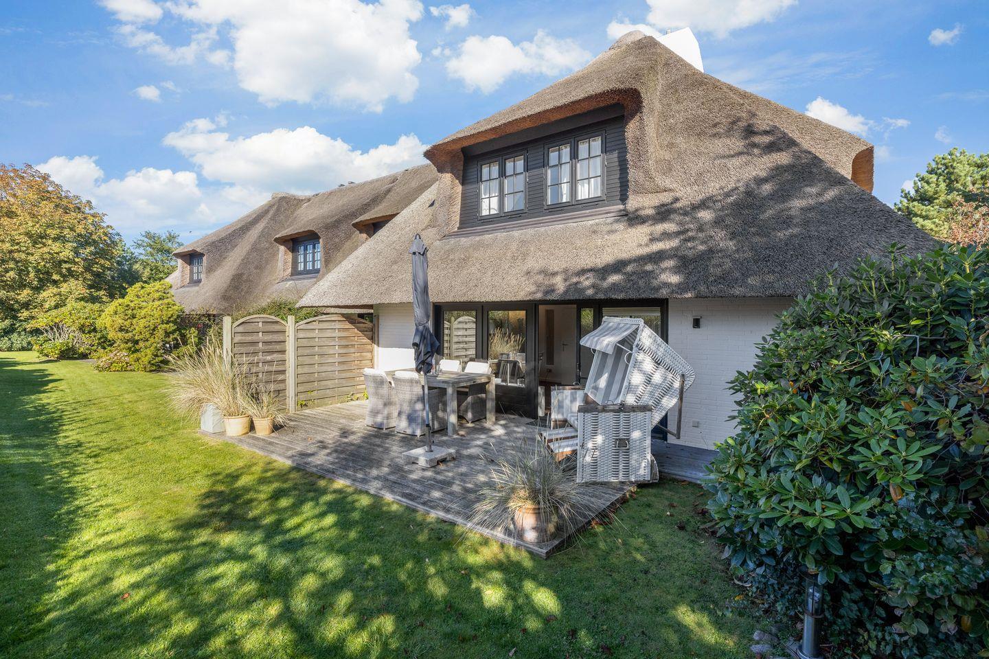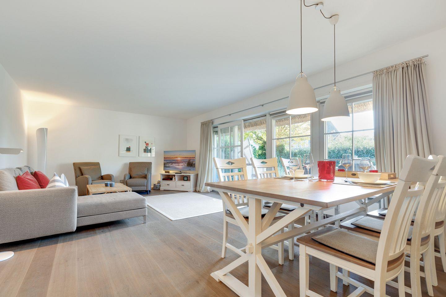 Die hier vorgestellte, sonnige Ferienwohnung im Erdgeschoss ist ca. 75 m² groß und bietet zwei Personen großzügigen Platz. Die Wohnung liegt in einer reetgedeckten Wohnanlage mit einer Terrasse in Südwestlage. In der Anlage befinden sich acht Eigentumswohnungen. Die stilvolle, moderne Einrichtung zum Wohlfühlen bietet Ihnen auf einer Ebene jeglichen Komfort wie Flat-TV, WLAN, Stereoanlage mit CD, Fön, Geschirrspüler, 2 Cerankochfelder, Mikrowellen-Backofen, Waschmaschine und Pkw-Stellplatz.