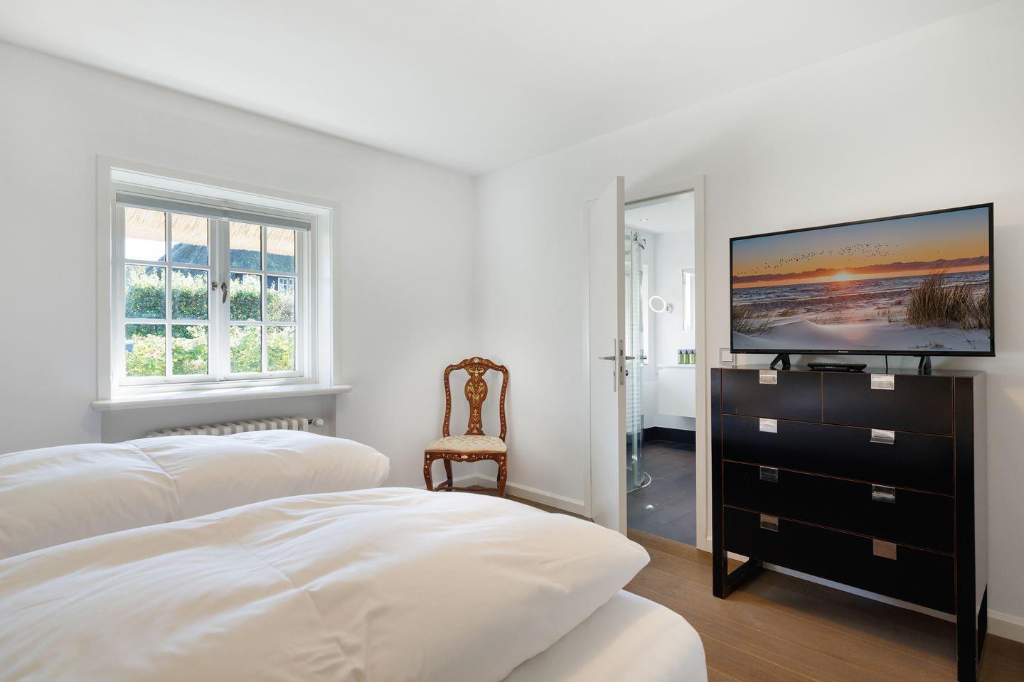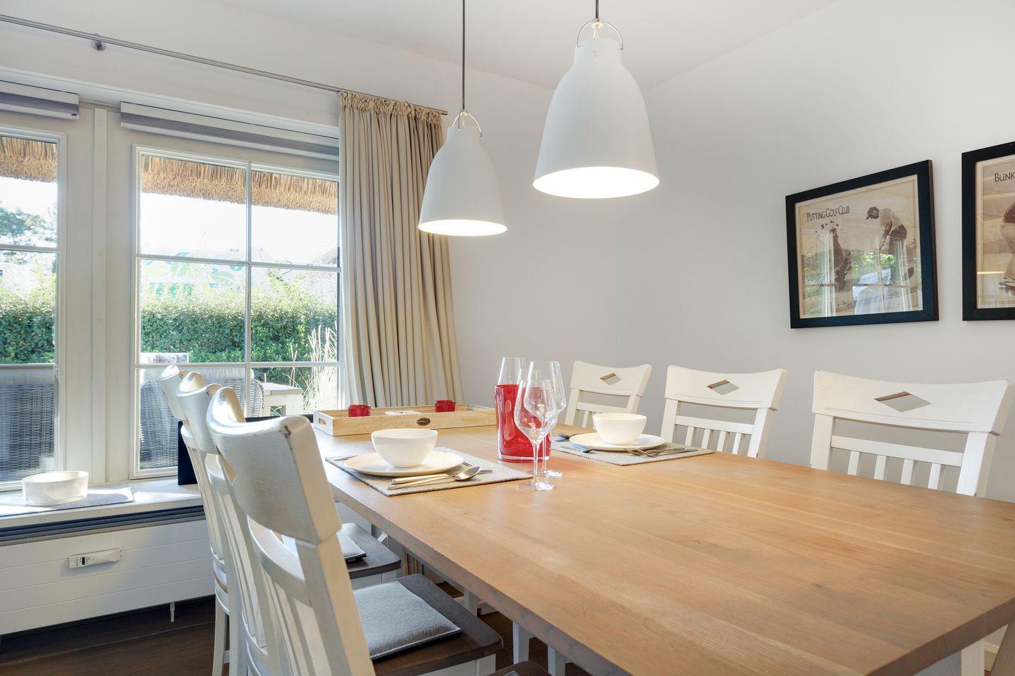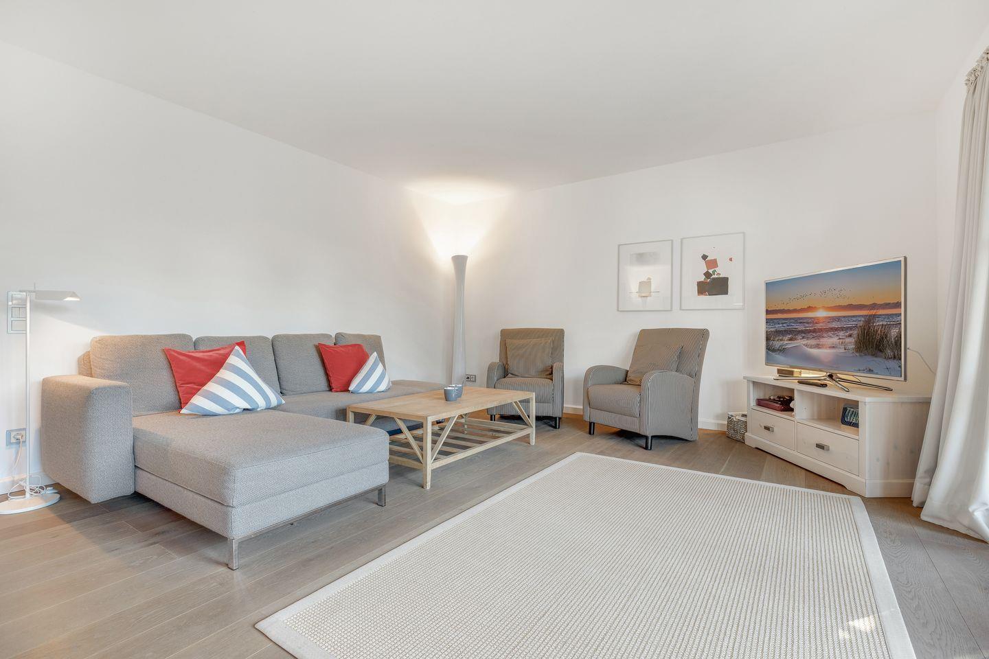 Die hier vorgestellte, sonnige Ferienwohnung im Erdgeschoss ist ca. 75 m² groß und bietet zwei Personen großzügigen Platz. Die Wohnung liegt in einer reetgedeckten Wohnanlage mit einer Terrasse in Südwestlage. In der Anlage befinden sich acht Eigentumswohnungen. Die stilvolle, moderne Einrichtung zum Wohlfühlen bietet Ihnen auf einer Ebene jeglichen Komfort wie Flat-TV, WLAN, Stereoanlage mit CD, Fön, Geschirrspüler, 2 Cerankochfelder, Mikrowellen-Backofen, Waschmaschine und Pkw-Stellplatz.