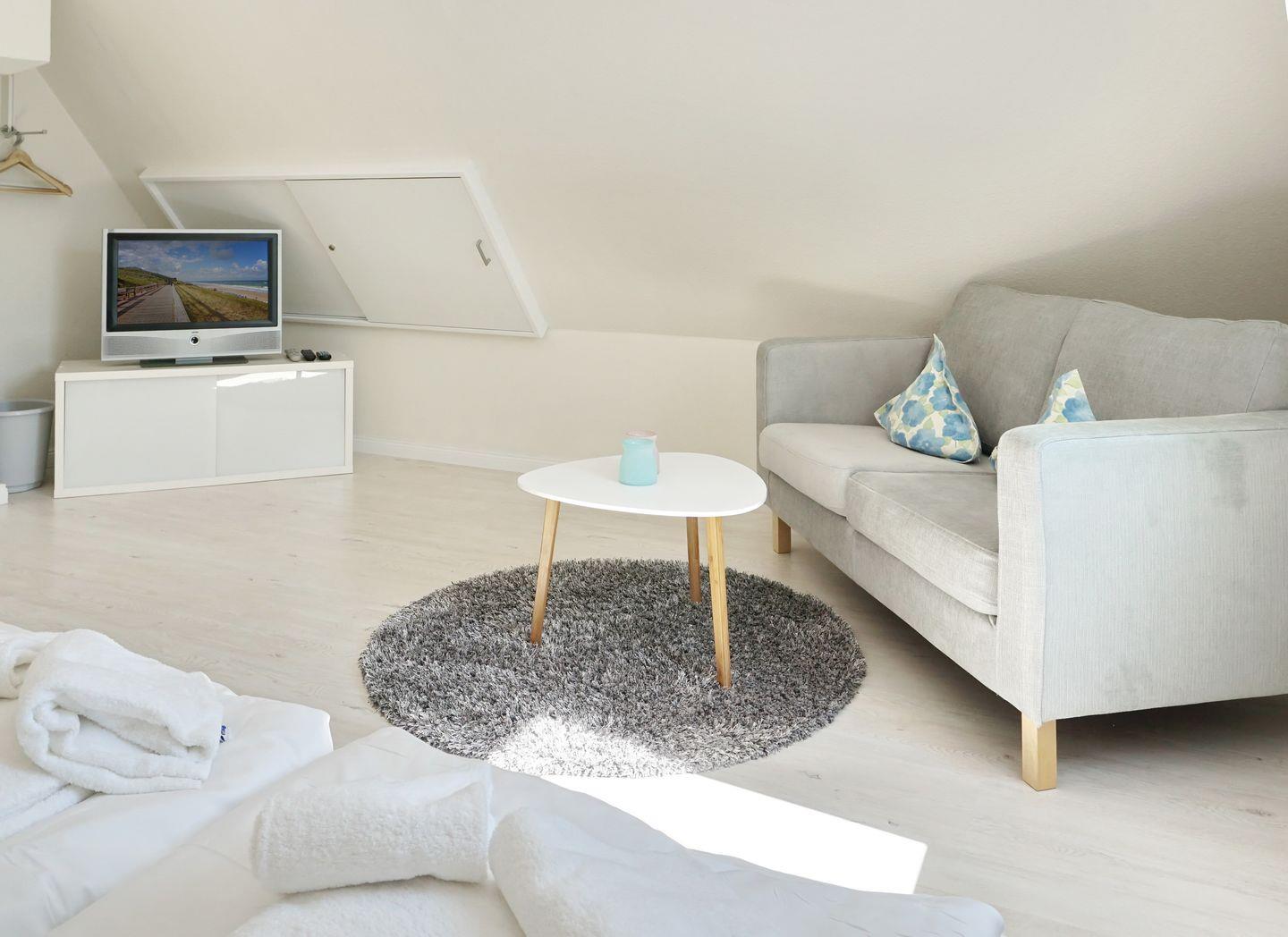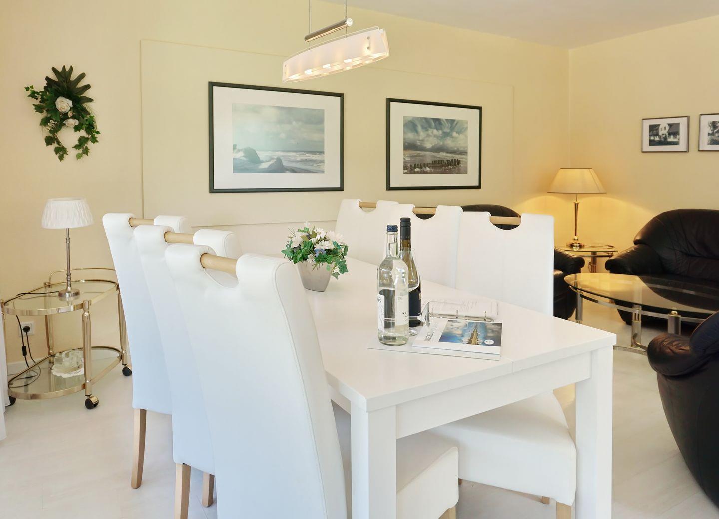 Wohn-/Essbereich: heller großzügiger Wohnraum mit zwei Couchen sowie Sessel als Sitzgruppe, runder Esstisch mit vier (sechs) Stühlen
