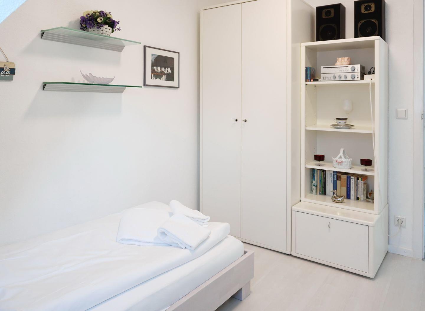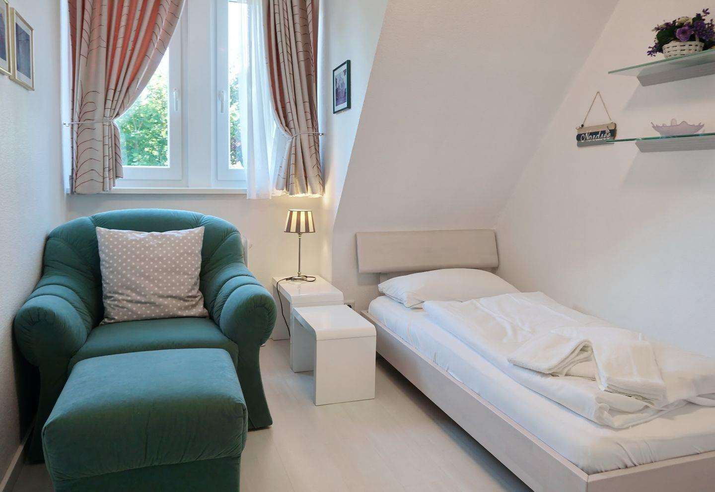 Schlafen 2: Schlafraum mit Einzelbett (ohne Fußende), Schrank, Sessel, kleine Stereoanlage sowie Laminatboden