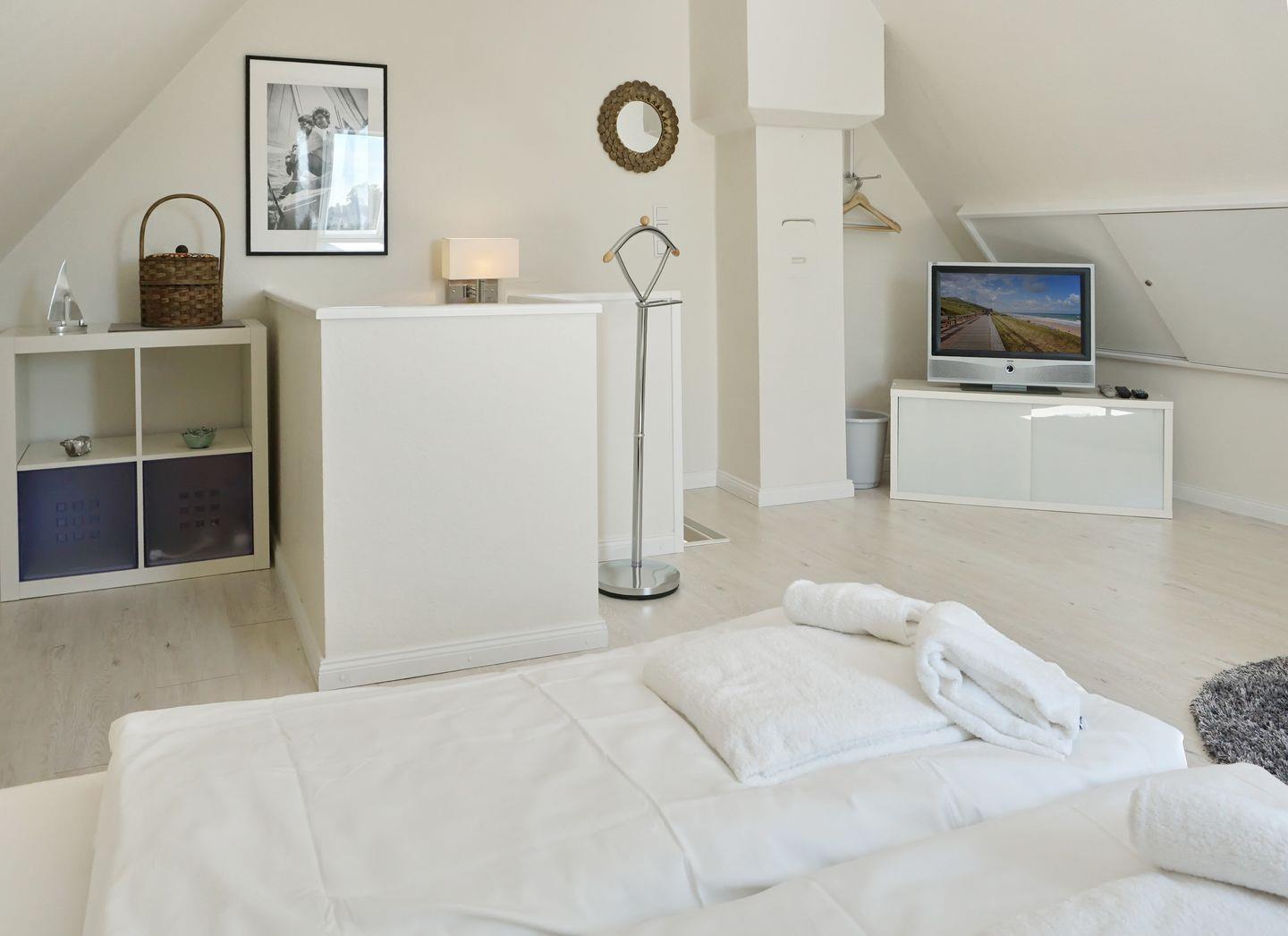 Schlafen 4: Schlafraum mit Doppelbett (ohne Fußende), zusätzlichem TV sowie Plattenspieler und kleinem Tisch