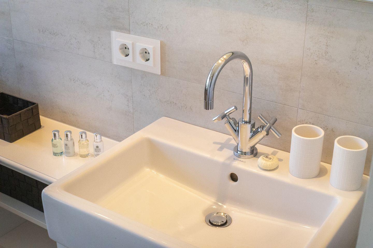 Badezimmer: helles, modernes Duschbad mit elektrischem Handtuchwärmer