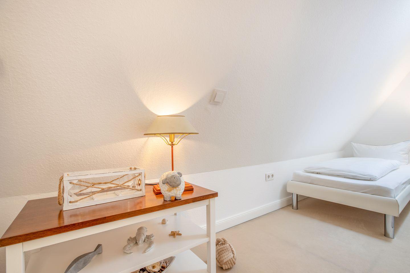 Vom Schlafzimmer im OG geht eine offene Treppe ins Dachgeschoss, hier befindet sich ein weiterer Raum mit zwei Einzelbetten (ohne Fußteil) unter Schrägen und kleinem Einbauschrank