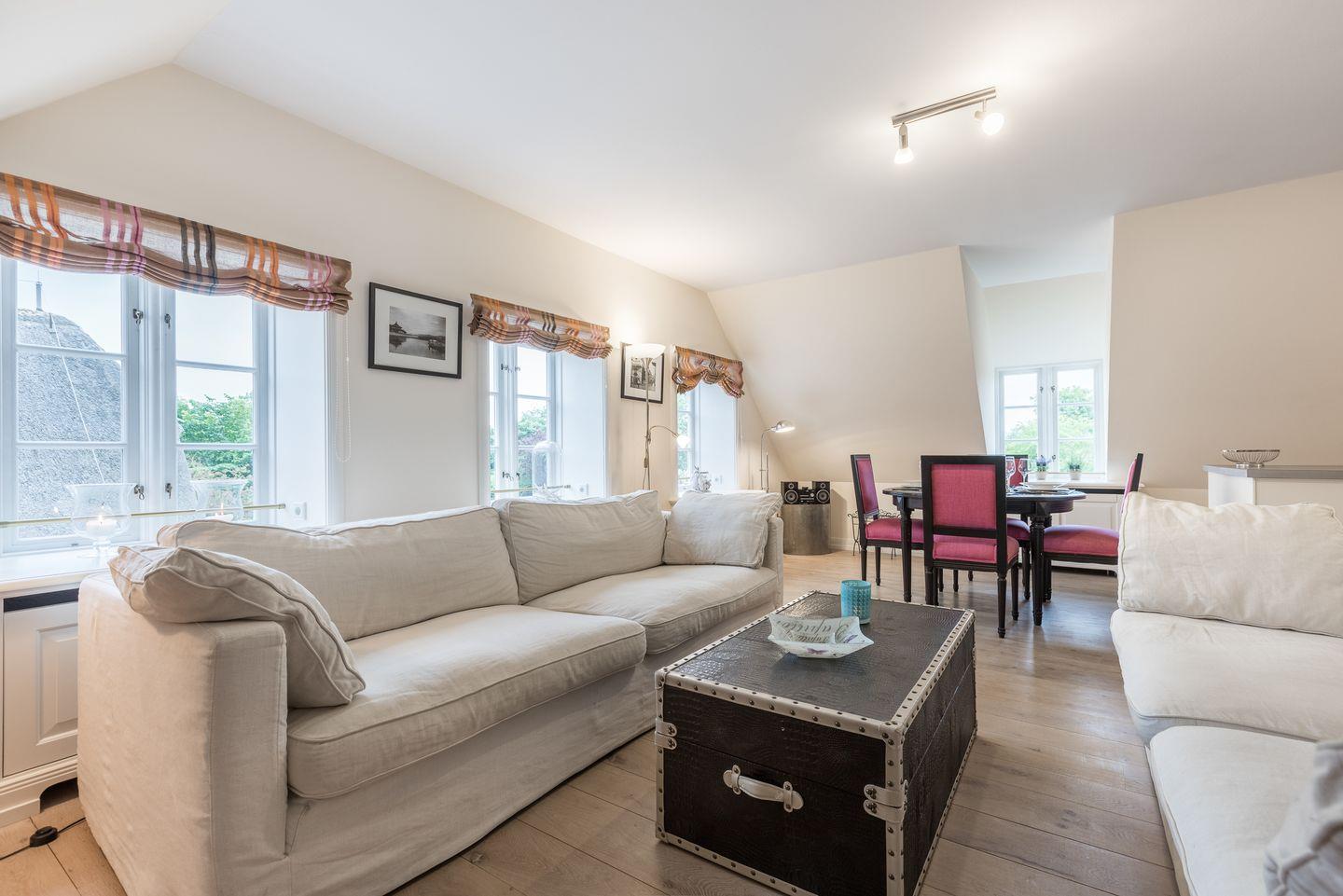 Die hier vorgestellte, sehr großzügig geschnittene OG-Wohnung ist ca. 121 m² groß & bietet zwei bis vier Personen Platz. Das reetgedeckte Haus liegt im historischen Kern von Keitum, in einem Gebäudekomplex mit dem Restaurant Amici, keine 5 Gehminuten vom Wattenmeer entfernt. Durch den Holzfußboden und stilvollem Mobiliar entsteht eine Atmosphäre zum Entspannen und Erholen. Die Wohnung verfügt über Komfort wie Kamin, Flat-TV, W-LAN, Bose Anlage, Cerankochfeld, Geschirrspüler & Nespressomaschine.