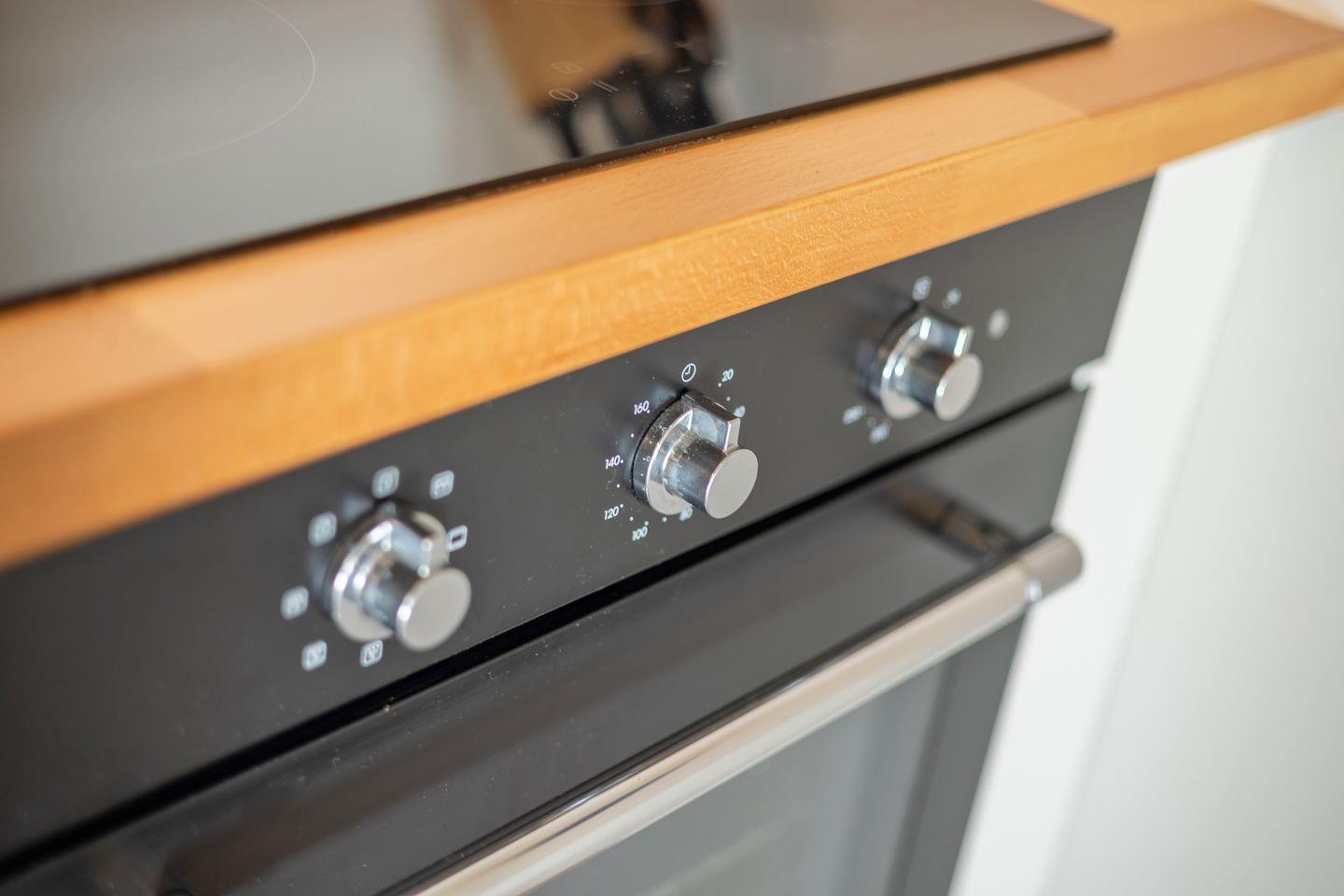 Die Küchenzeile ist mit Herd, Backofen und Geschirrspüler ausgestattet