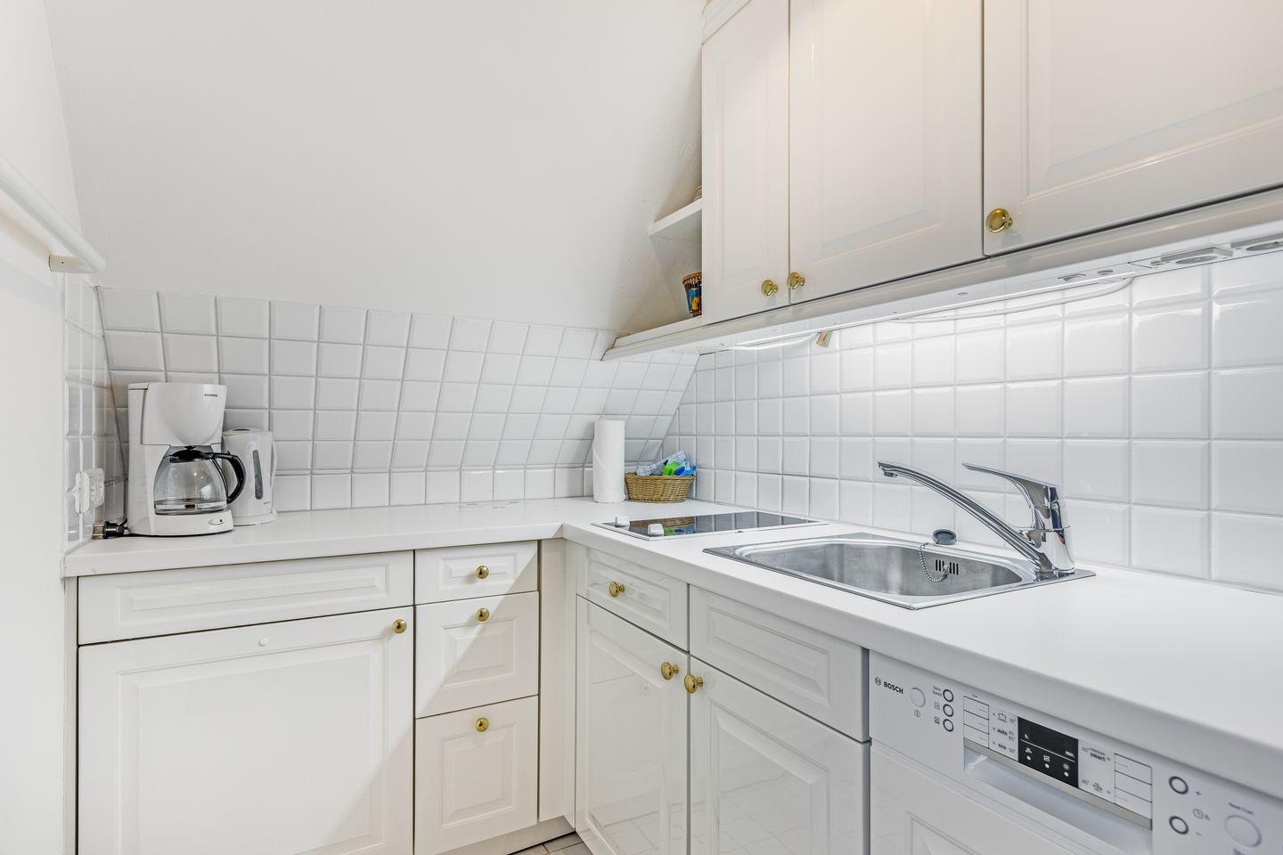 Kleine offene Küche, die mit Spülmaschine, Kaffeefiltermaschiene, Wasserkocher, kein Backofen vorhanden