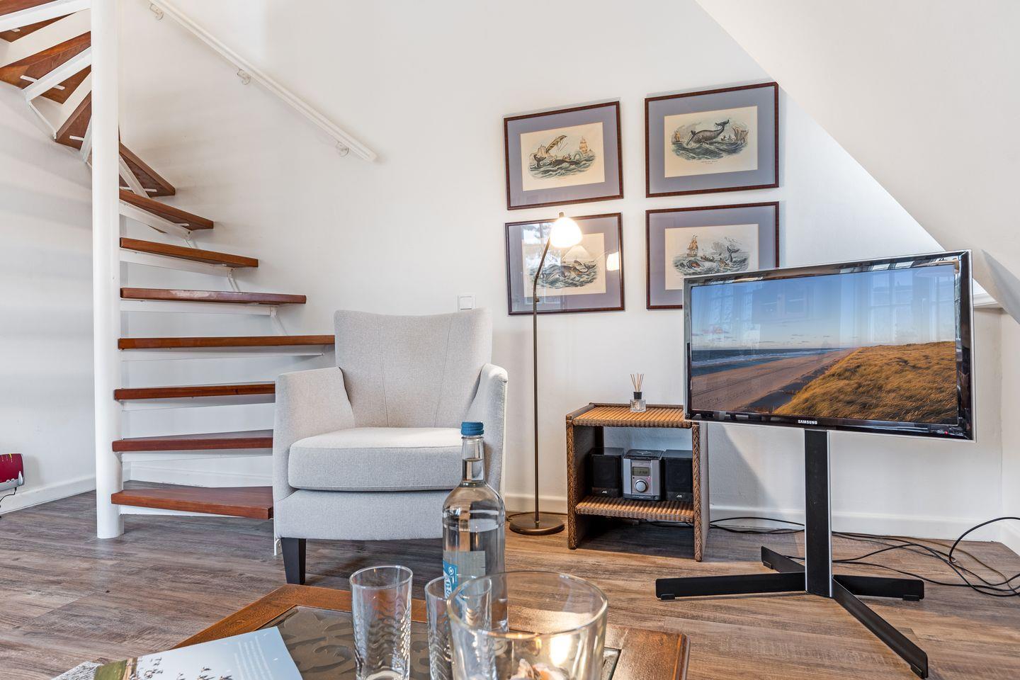 Freundlicher und heller Wohnraum im Obergeschoss, im Wohnzimmer sind TV und Radio (WLAN vorhanden)