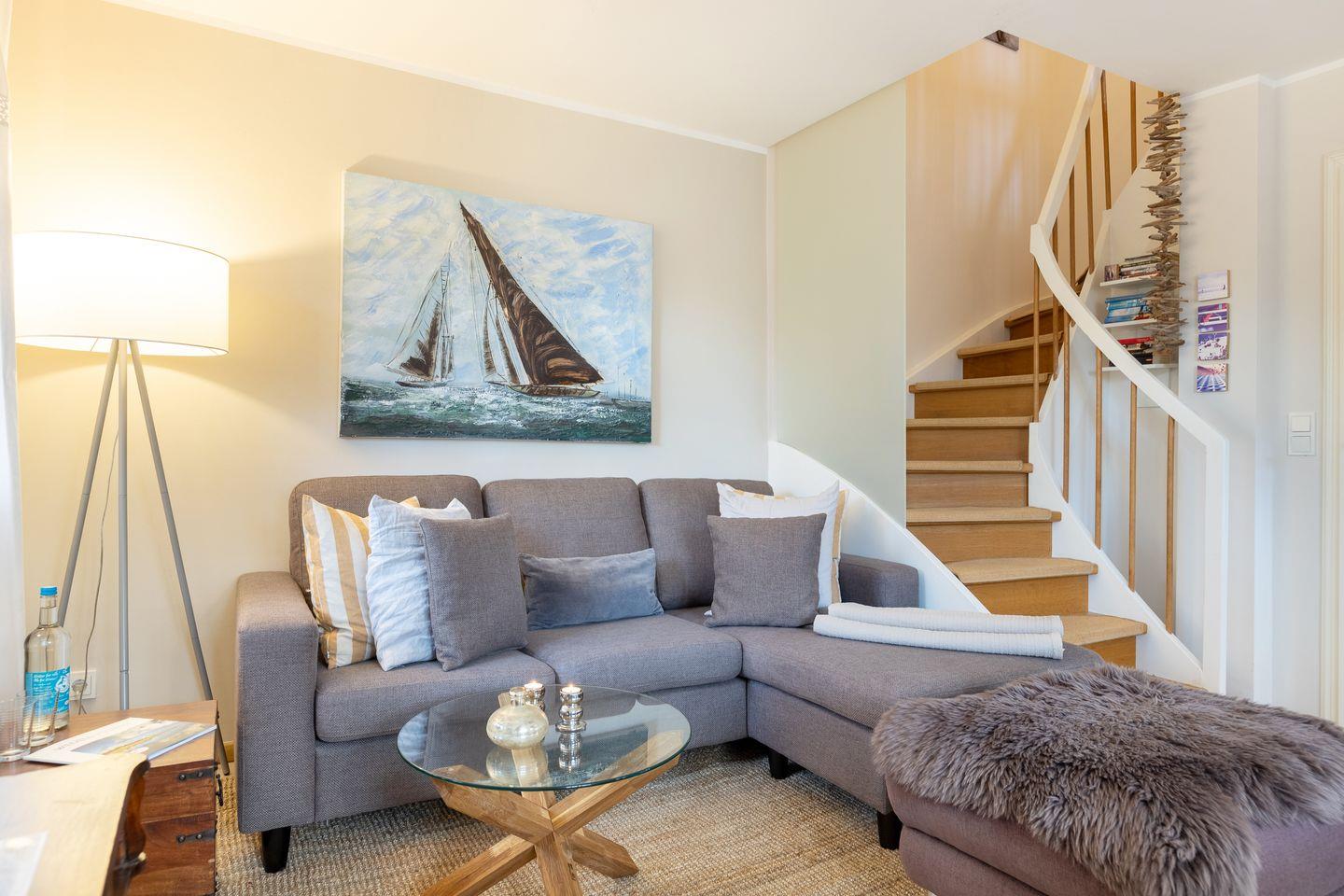 Das Hausteil INA ist mit ca. 50 m² ist individuell und besonders liebevoll für bis zu 4 Personen eingerichtet. Im Erdgeschoss befindet sich der großzügige, helle Wohn- /Essbereich mit angegliederter moderner, komplett ausgestatteter - Küche (GS, Cerankochfeld, Backofen, Mikrowelle, etc.). Dazu ein helles, modernes Duschbad (Ganzglasabtrennung, Designerwaschtisch, Fußbodenheizung, etc.). Im KG steht eine Waschmaschine zur Verfügung.
