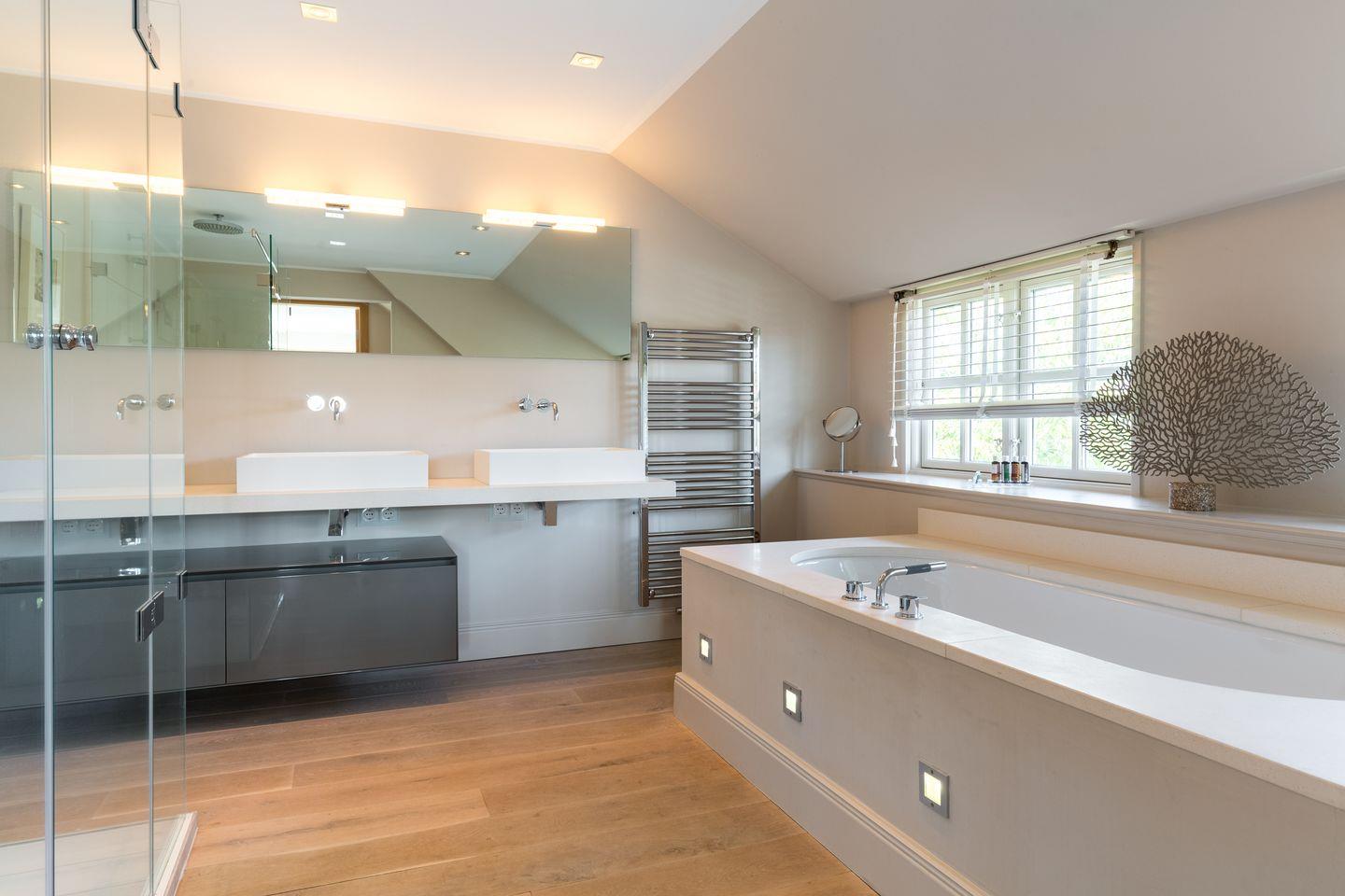 Im Obergeschoss erwartet Sie Ihre stilvolle und großzügige Schlafwelt: Sehr schöner, großer und lichtdurchfluteter Masterbedroom mit reichlich Schrankplatz. Für Ihren wohligen Schlaf sorgt das Designbett mit bester Schlafarchitektur von der Schlafspezialistenfirma Schramm (ca. 2x2 m). Ensuite Bade-Welt mit Wanne, großer Dusche, WC und Design-Doppelwaschtischen. Ebenfalls finden Sie im Obergeschoss einen Kids-Room mit Kindermobiliar und kuschelig eingebauter Liegewiese (ca. 1,8x2 m). Ein weiterer, hübsch dekorierter Schlafraum bietet zwei Personen Platz in einem komfortablen Doppelbett (ca. 1,8x2 m). Ein Einzelzimmer steht Ihnen ebenfalls noch zur Verfügung, mit hübsch eingebautem Bett und Ablageflächen, ebenso, wie ein weiteres Bad mit großer Dusche, WC und Doppelwaschtisch.