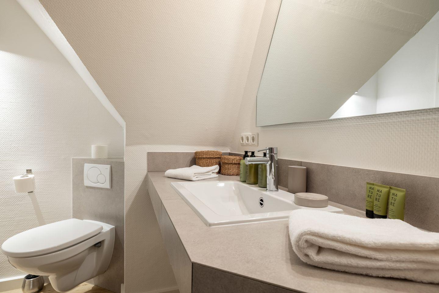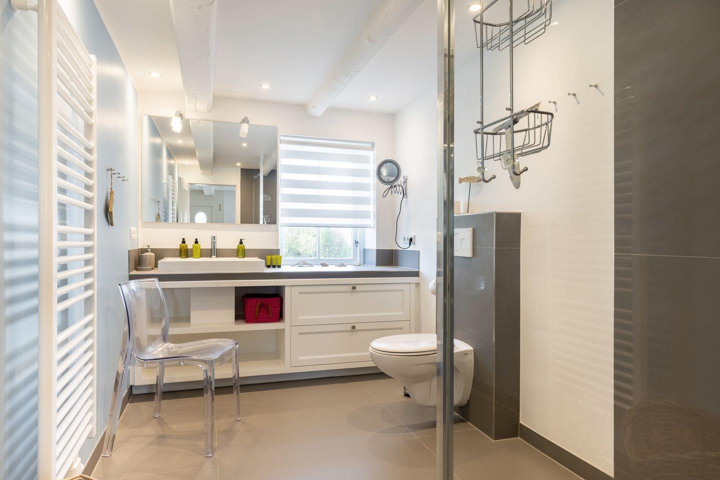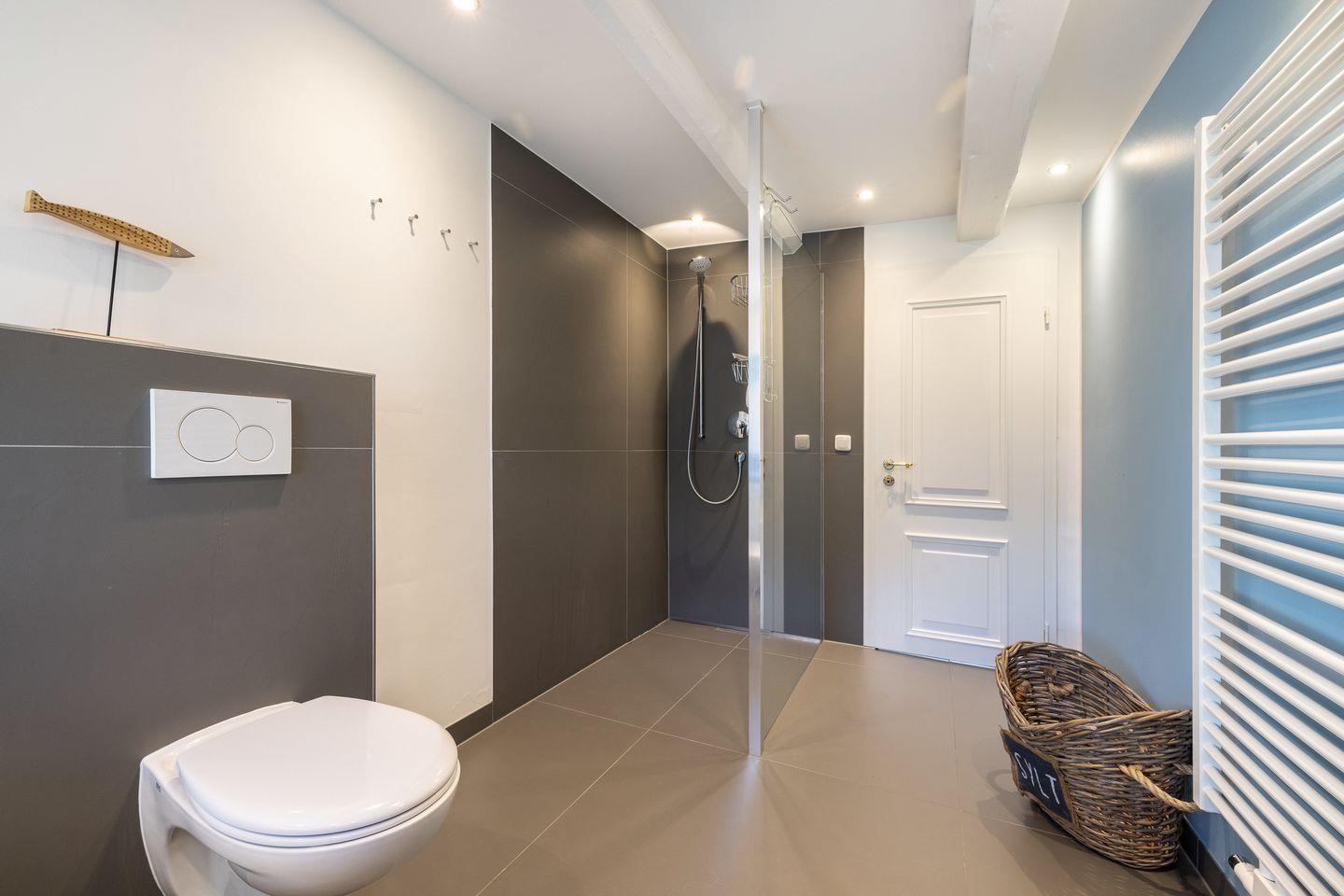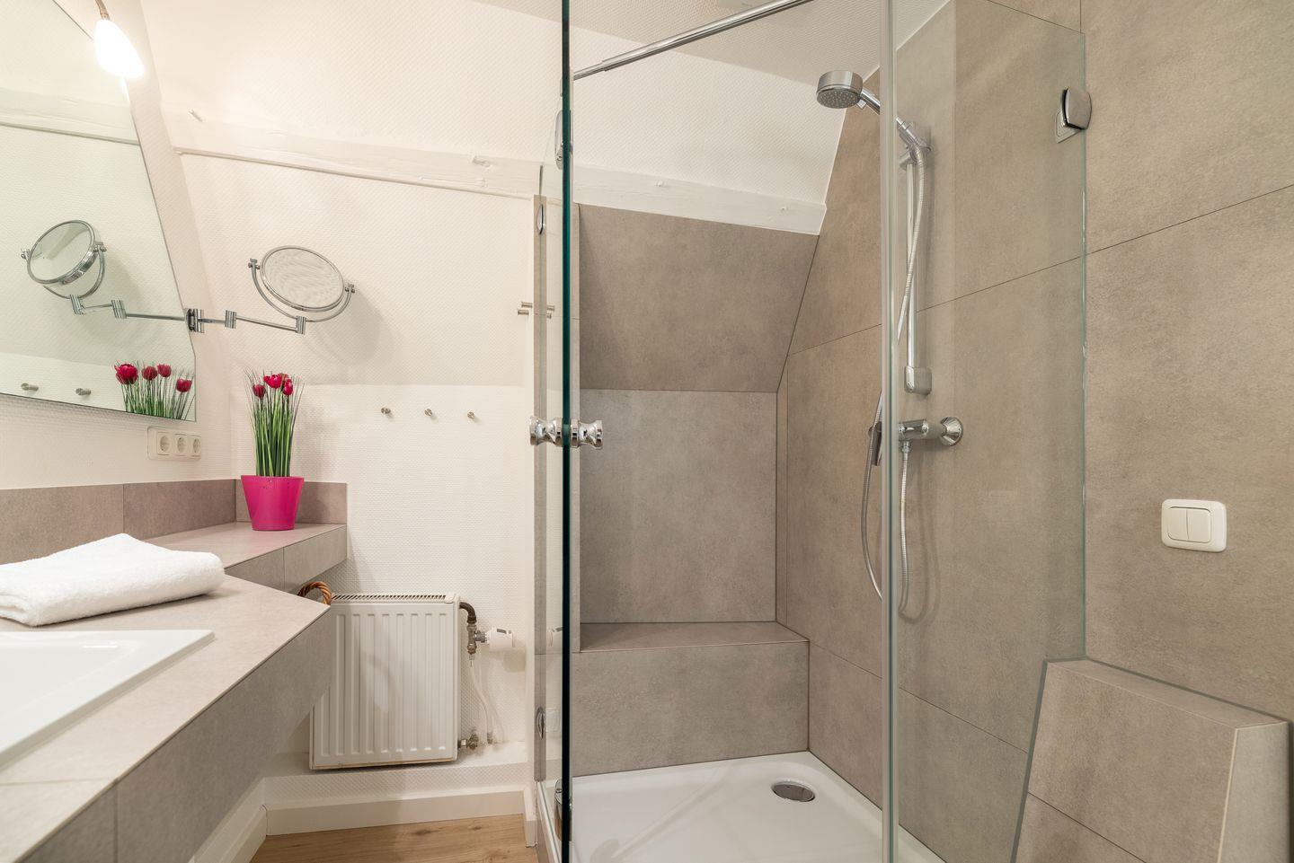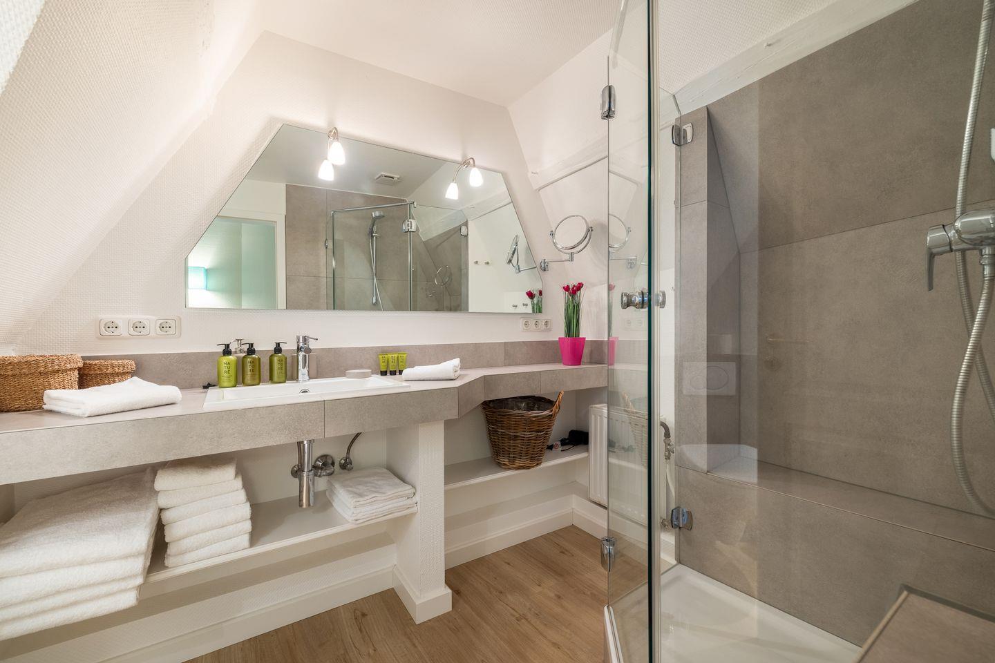 - 1 Badezimmer mit begehbarer Dusche, WC und Schminkspiegel