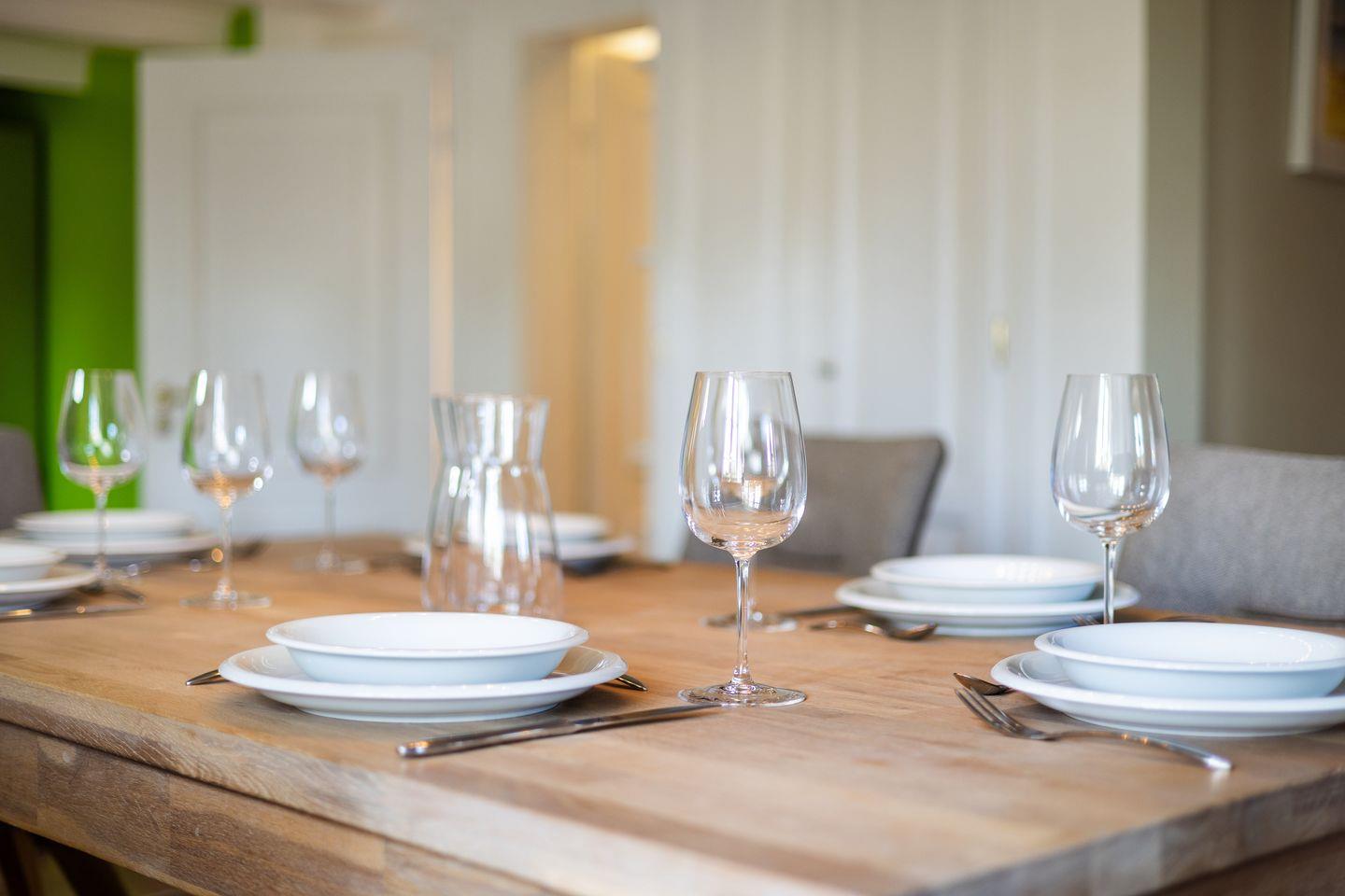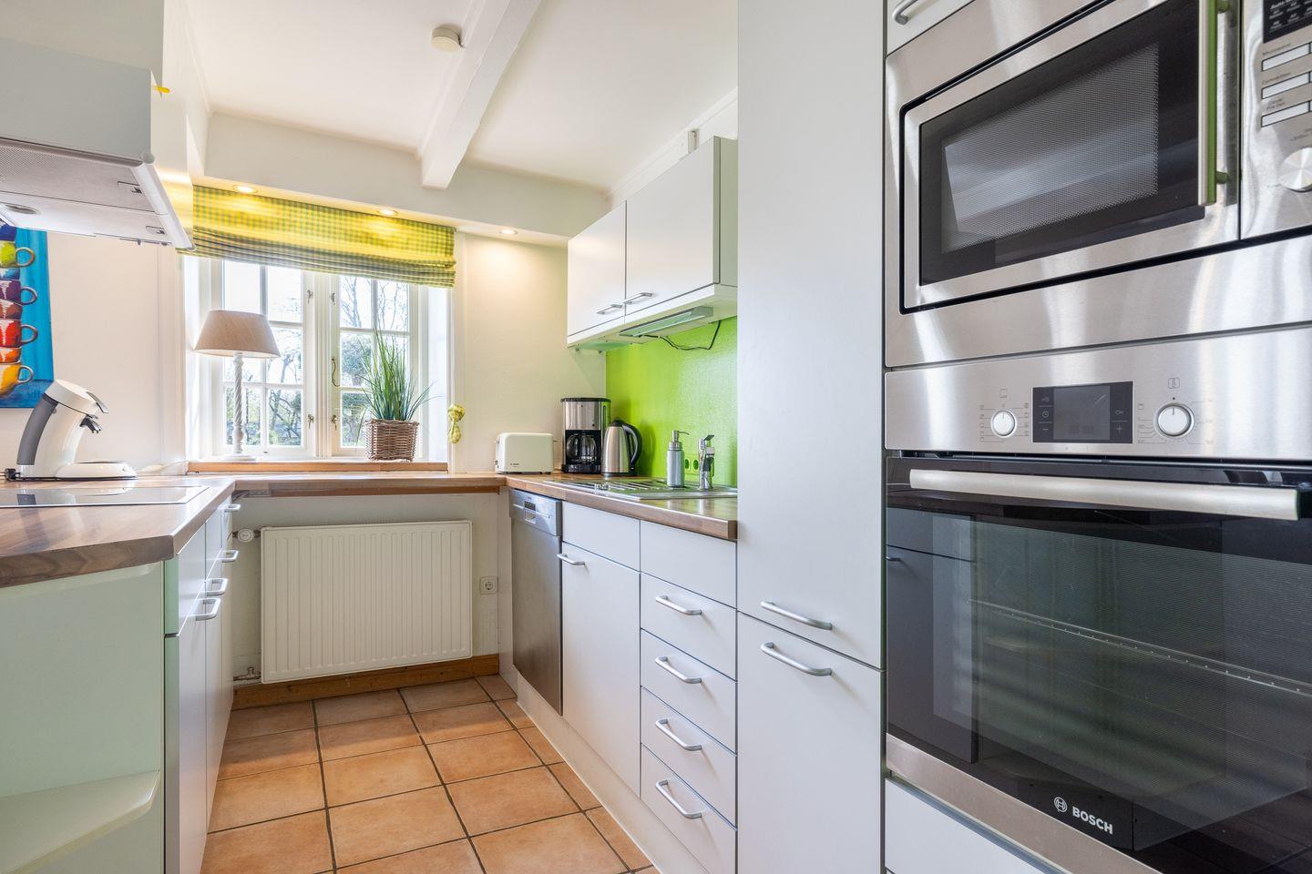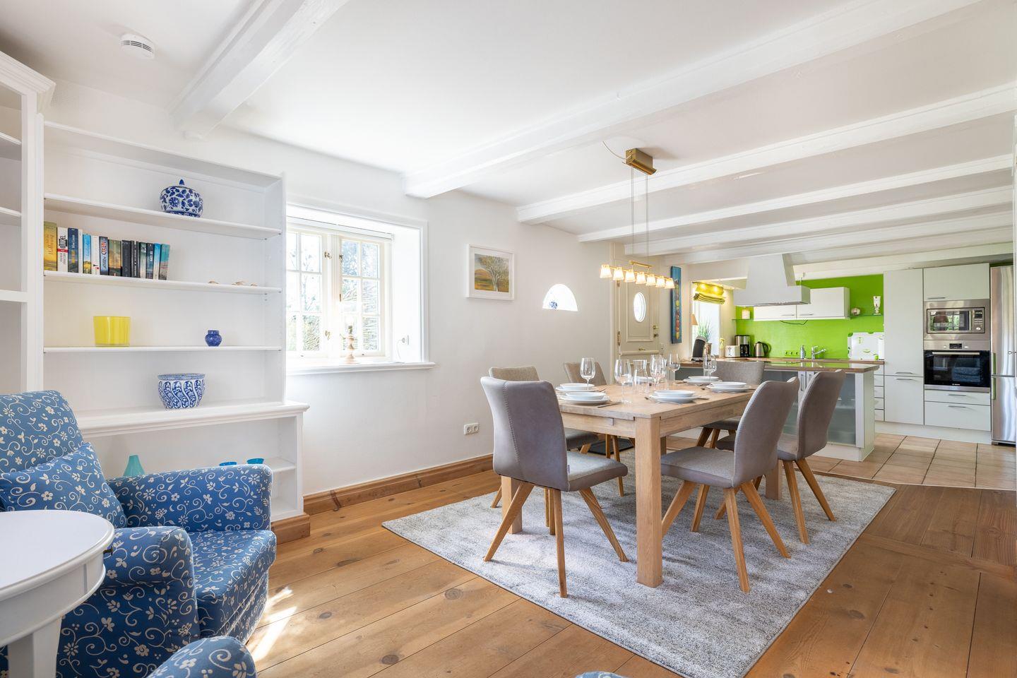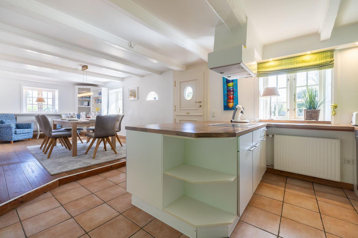 - große, geräumige Küche mit Backofen, Mikrowelle, Kühlschrank mit extra Tiefkühlschrank, Geschirrspüler usw. der Essbereich geht von der Küche über, Kochen und geselliges Miteinander ist hier Programm, von hier aus haben Sie durch die Klönsnacktür Zutritt zur Terrasse mit Gartengestühl (April bis Oktober) und der Sonnenkuhle mit einem Strandkorb ( Südlage)