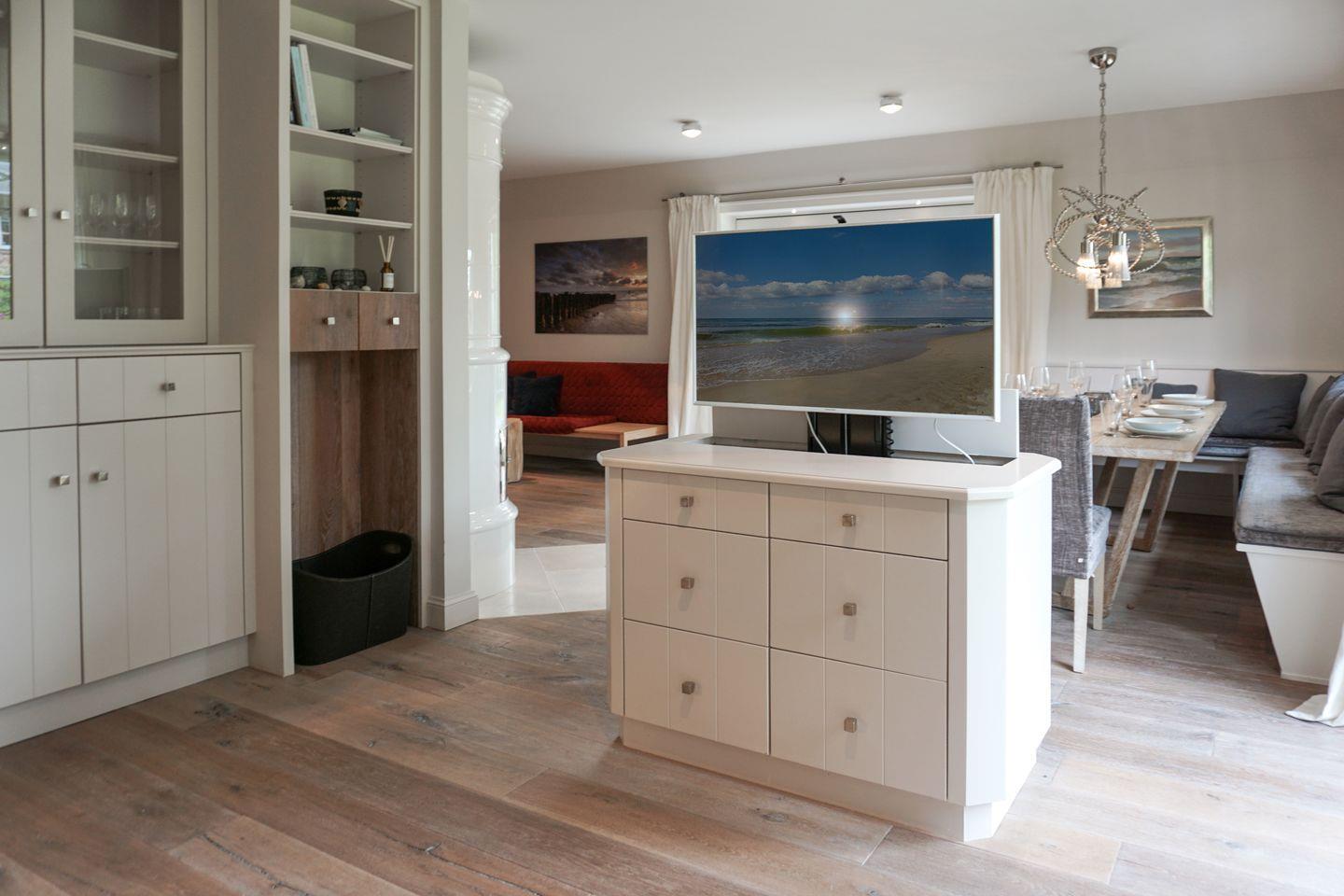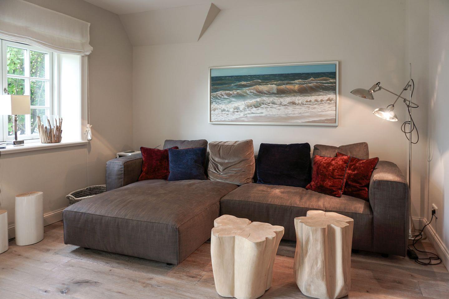 Im Inneren des Hauses verteilen sich fünf Zimmer über drei Etagen. Insgesamt stehen Ihnen vier Schlafzimmer zur Verfügung, davon zwei im Untergeschoss und zwei in der oberen Etage. 3 der vier Schlafzimmer haben das Bad en suite. Alle Schlafzimmer sind mit Dielenboden ausgestattet, der ebenso wie der Fußboden im Wohnzimmer eine warme und einladende Atmosphäre schafft. Die Wohnräume sind großzügig gestaltet und zeichnen sich durch eine hochwertige Möblierung aus. Eine gemütliche, große Sofaecke und ein moderner Kaminofen im Wohnzimmer sorgen auch an kühleren Tagen für Behaglichkeit. Fünf digitale Fernseher ermöglichen Ihnen individuelle Unterhaltung in verschiedenen Räumen.