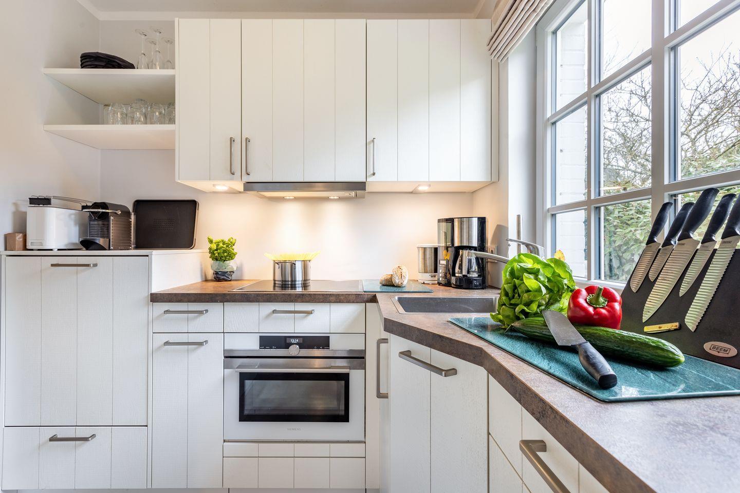 Die separate, geschlossene Küche ist ebenfalls umfassend ausgestattet: Ceran-Herd, Elektrobackofen, Kühlschrank mit Gefrierfach, Spülmaschine, Nespresso-Espressomaschine, Kaffeemaschine, Wasserkocher, Toaster sowie sämtliches Geschirr, Besteck und Küchenutensilien sind vorhanden.