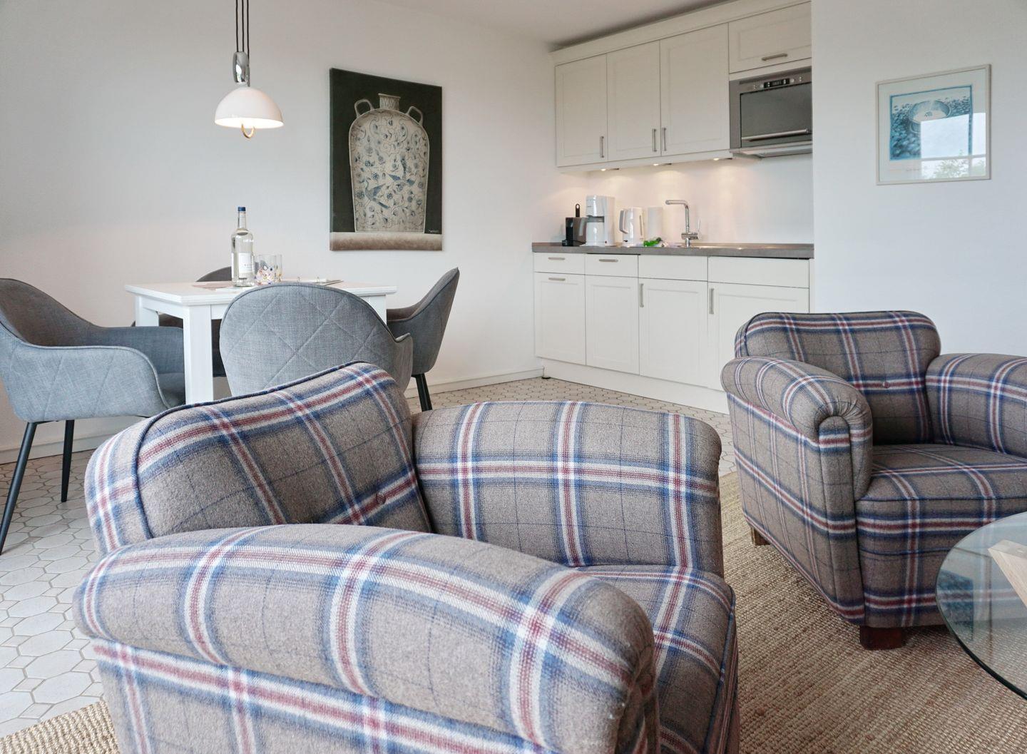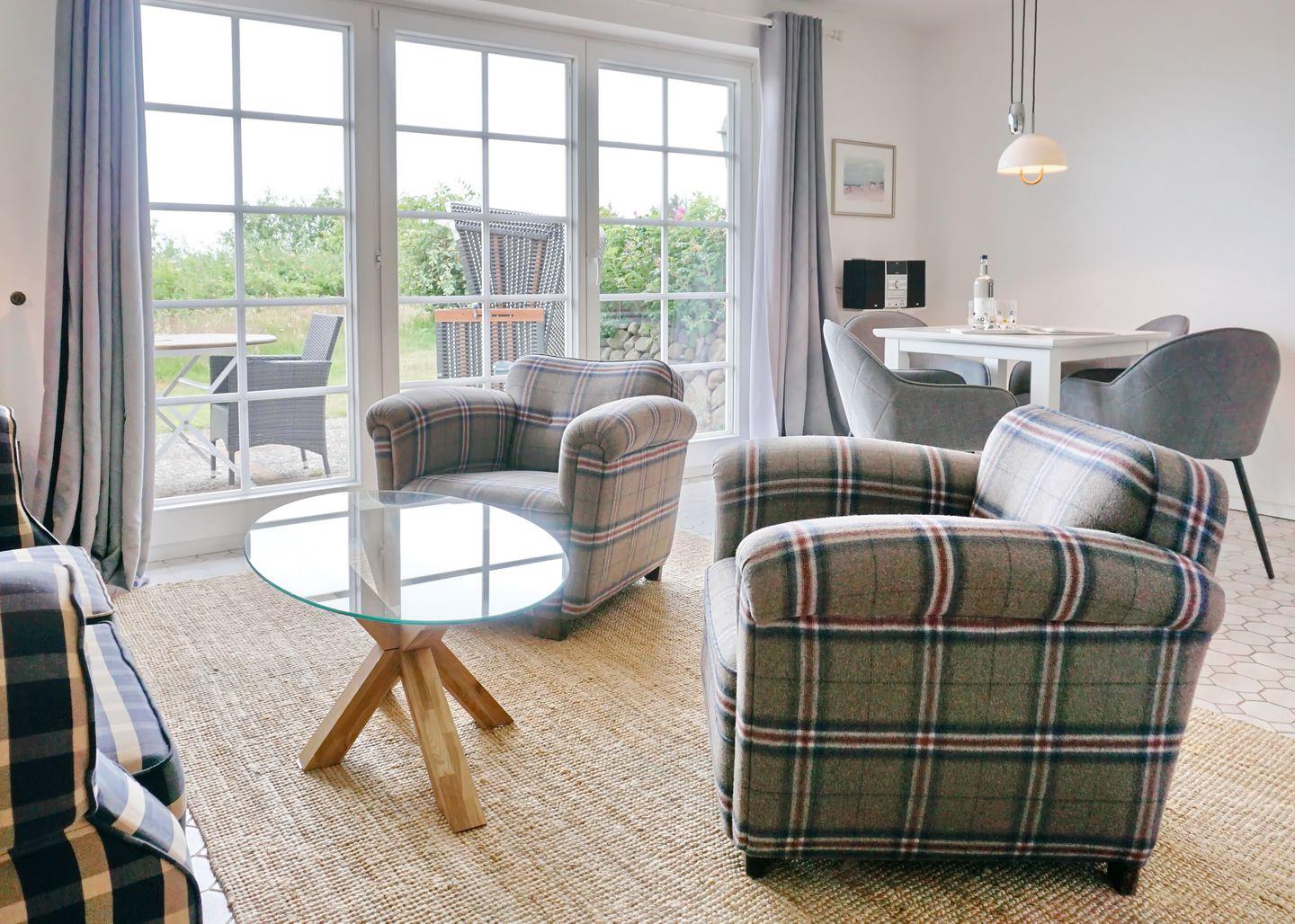Wohn-/Essbereich: geräumiges Wohnzimmer mit Couch und Sessel als Sitzgruppe, Essbereich: wunderschöner Blick zum Wattenmeer bis nach Keitum, Essecke mit rundem Esstisch und vier Stühlen