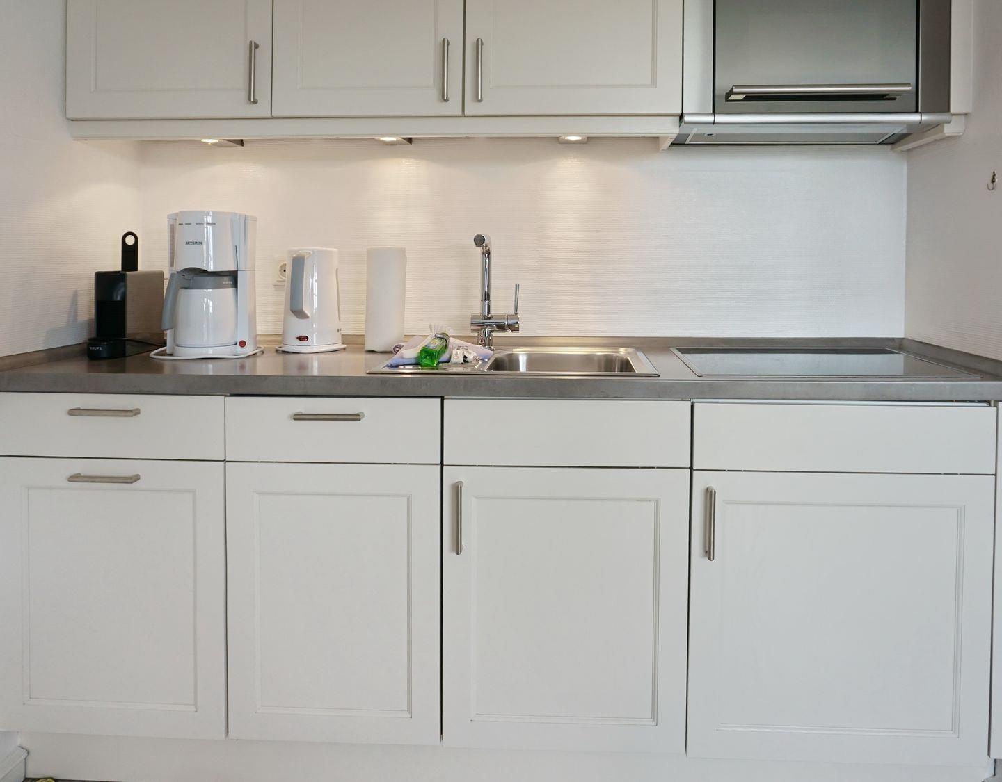 Küche: offene Küchenzeile im Wohnraum mit Induktionsfeld u. Geschirrspüler