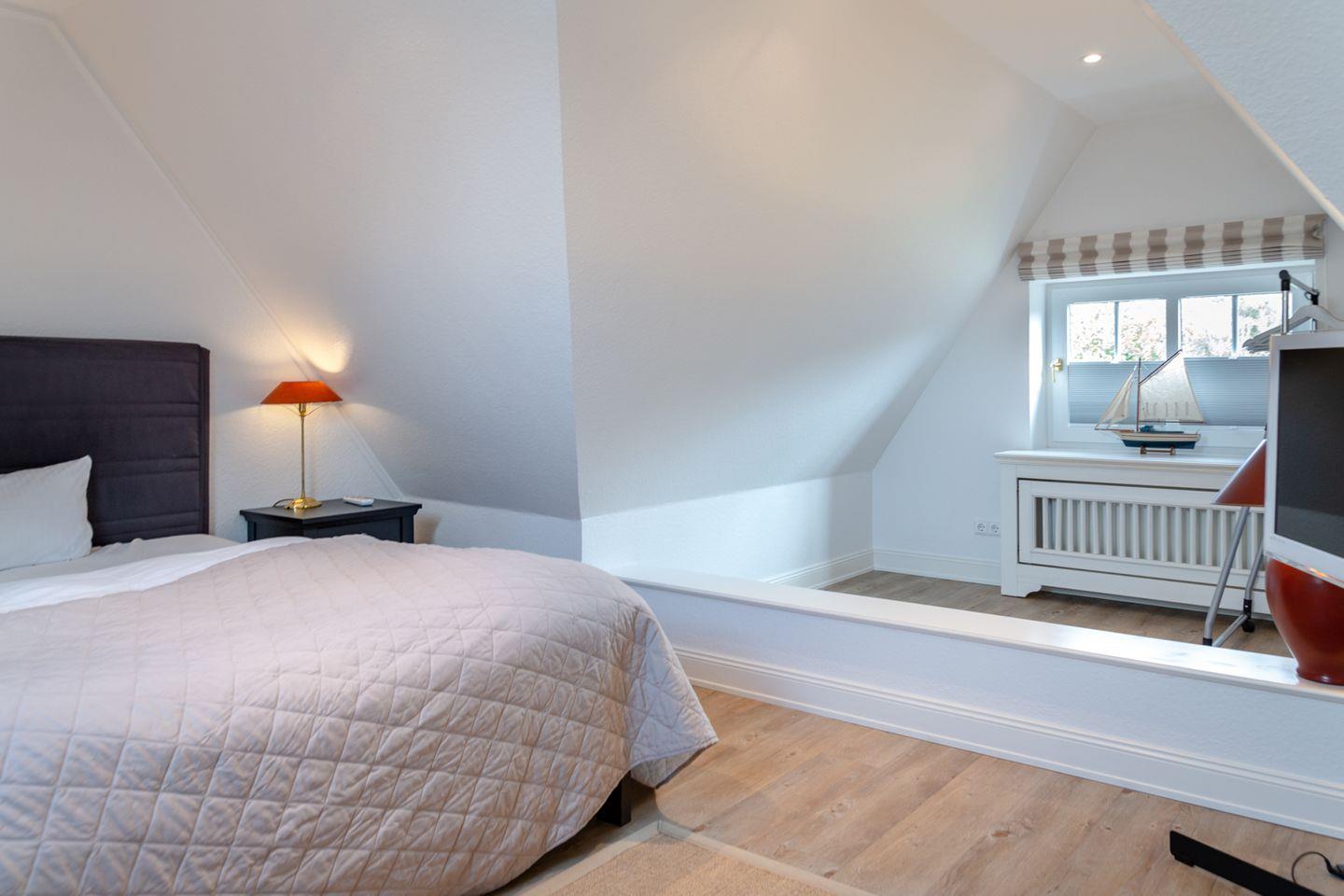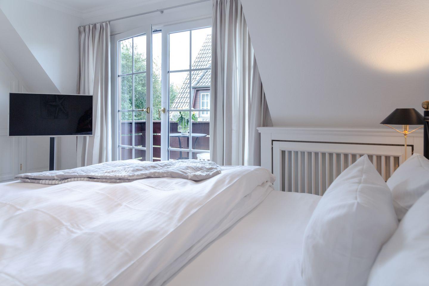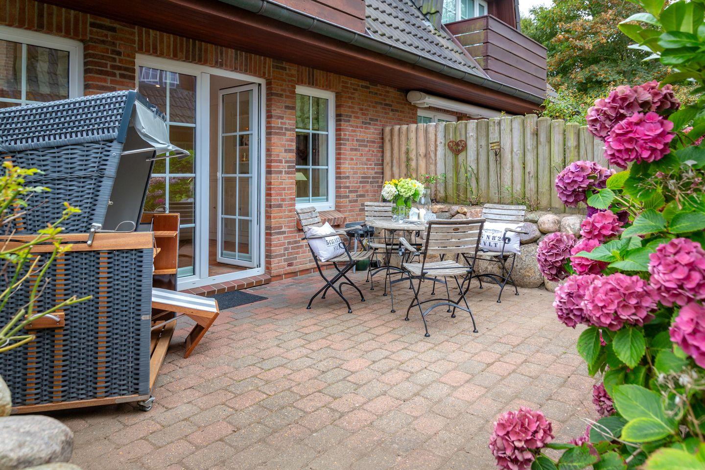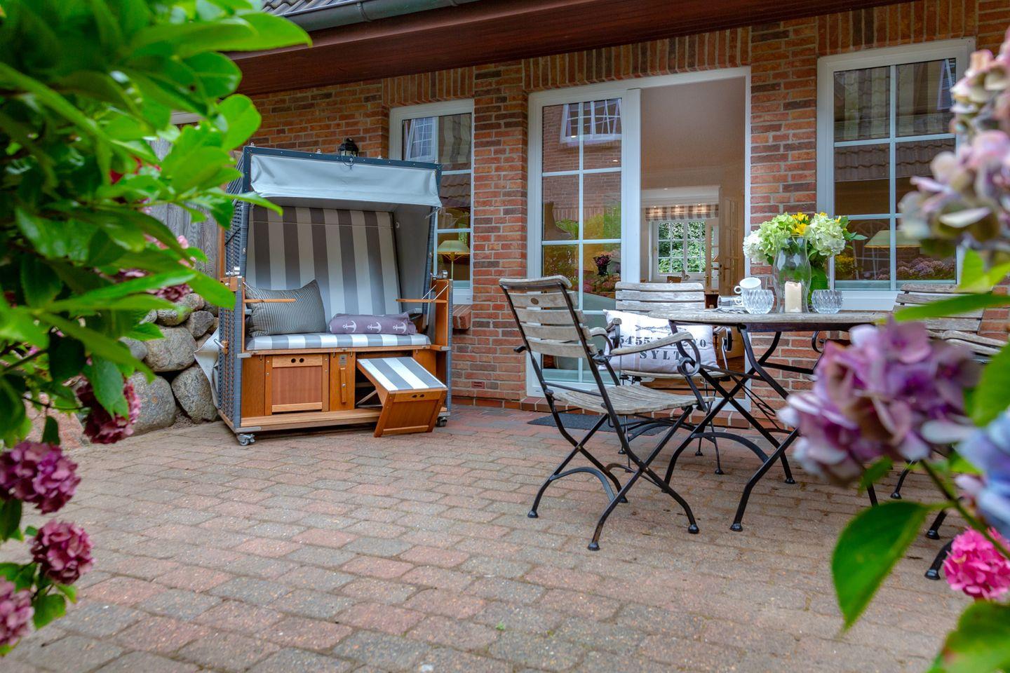 Die private Terrasse im Erdgeschoss ist nach Westen ausgerichtet und bietet die perfekte Kulisse, um Ihre Sonnenstunden im Strandkorb zu genießen. Die Schlafzimmer befinden sich auf der oberen Ebene, wobei zwei von ihnen mit komfortablen Doppelbetten ausgestattet sind und das dritte über ein bequemes Einzelbett verfügt. Ein Schlafzimmer bietet Ihnen zudem Zugang zu einem Balkon, auf dem Sie den Tag entspannt ausklingen lassen können.