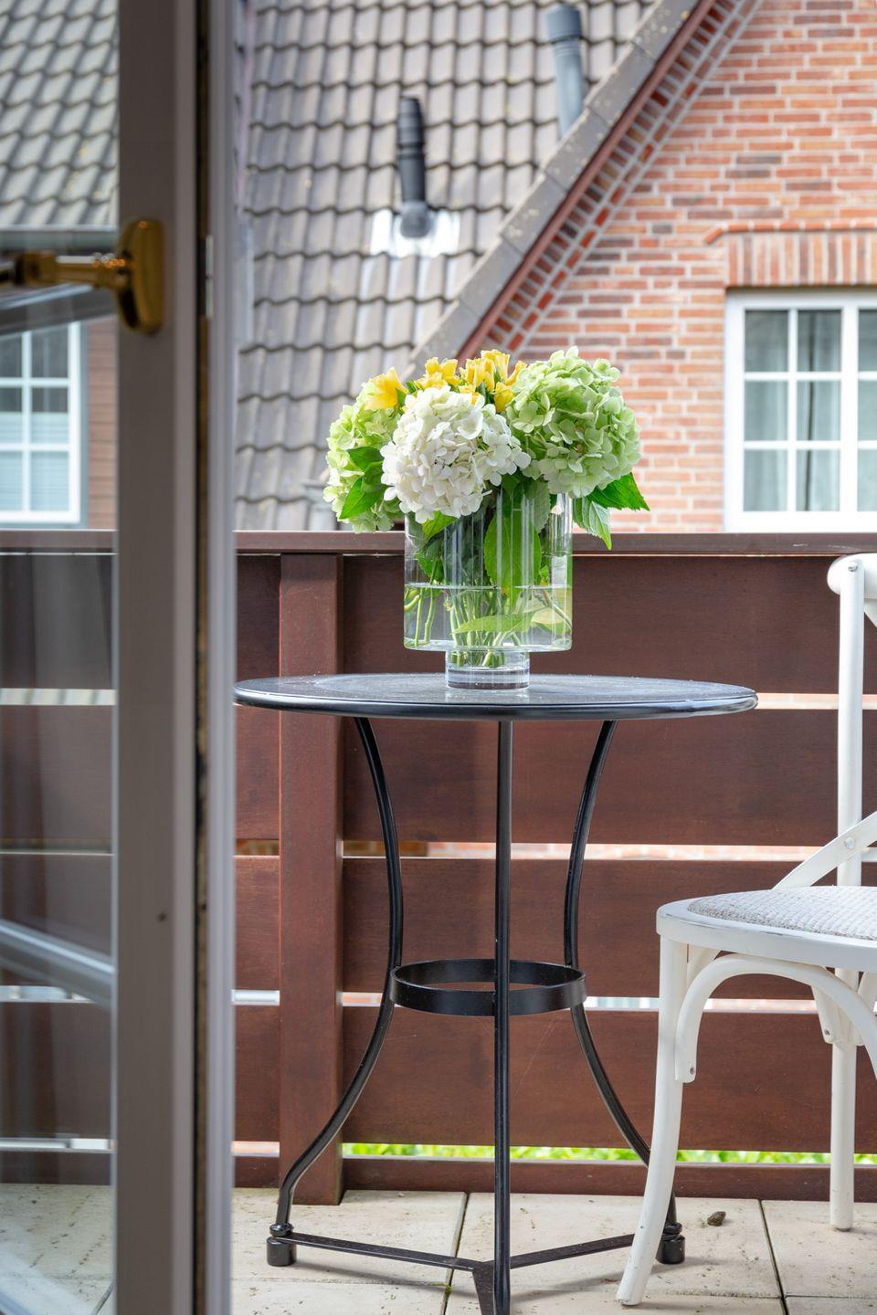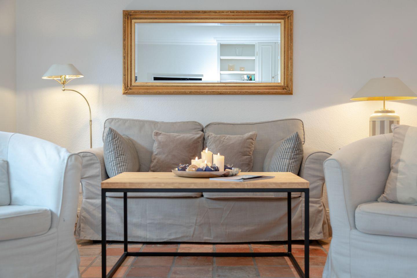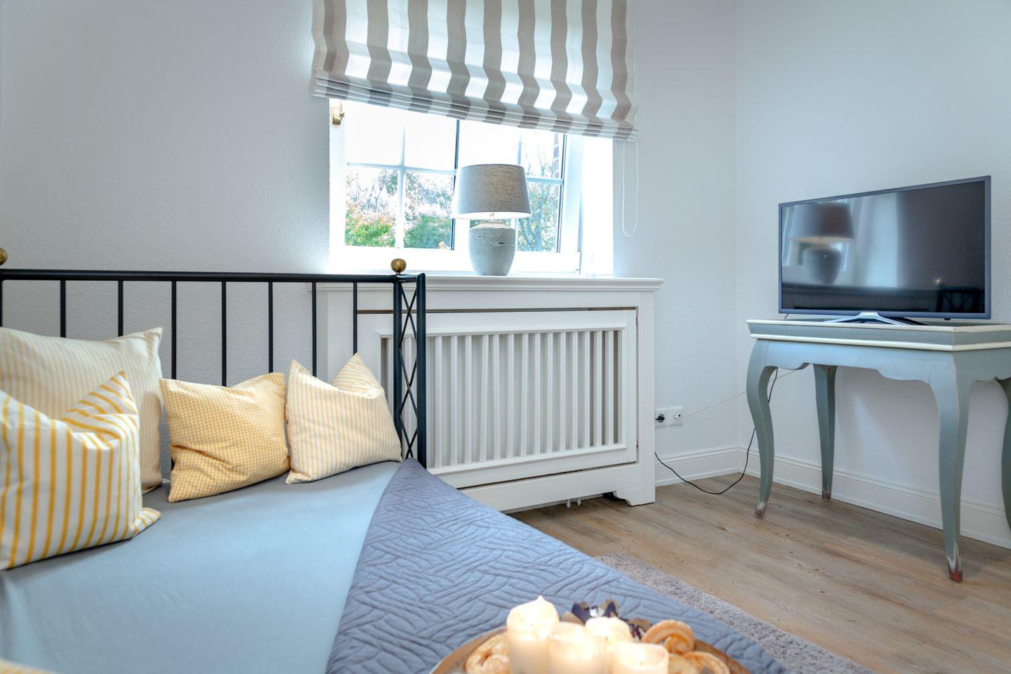 Die private Terrasse im Erdgeschoss ist nach Westen ausgerichtet und bietet die perfekte Kulisse, um Ihre Sonnenstunden im Strandkorb zu genießen. Die Schlafzimmer befinden sich auf der oberen Ebene, wobei zwei von ihnen mit komfortablen Doppelbetten ausgestattet sind und das dritte über ein bequemes Einzelbett verfügt. Ein Schlafzimmer bietet Ihnen zudem Zugang zu einem Balkon, auf dem Sie den Tag entspannt ausklingen lassen können.