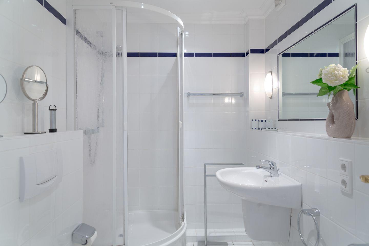 Das geräumige Badezimmer mit Dusche lädt dazu ein, persönliche Wellness-Momente zu erleben und sich zu entspannen.