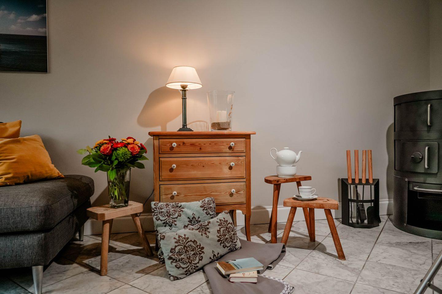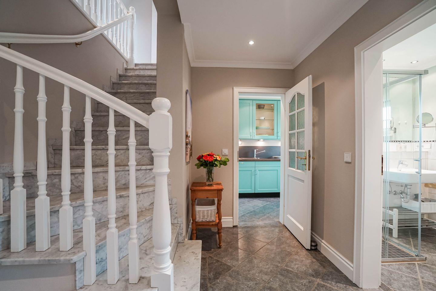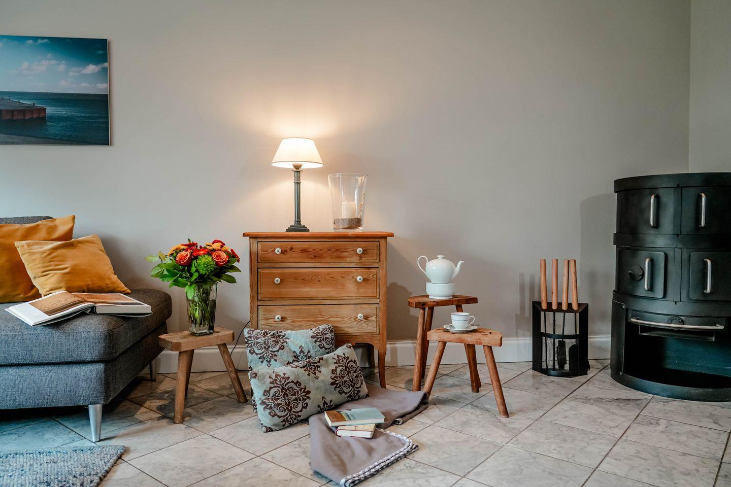Moin und herzlich Willkommen im Ferienhaus „Oene“ in Tinnum, einem Hausteil für bis zu fünf Personen ganz in der Nähe der Tinnumer Salzwiesen, genau dort also, wo sozusagen die Mitte von Sylt liegt und die Atmosphäre eher dörflich-gemütlich ist. Hier hört man an manchen Tagen noch das Klappern von Pferdehufen auf Asphalt, hier ist das urgemütliche „Hofcafé Klein‘er Kuhstall“ von Birgit Klein nur eben „um die Ecke“, das Rantumbecken nah und auch zum Strand der „Oase zur Sonne“ ist es nicht wirklich weit. Dieses attraktive Ferien-Domizil ist klar und nicht überladen eingerichtet, im Erdgeschoss gefliest, und mit allem Komfort ausgestattet, den man sich auch im Urlaub wünscht. Eine Waschmaschine ist da, ein Kaminofen sorgt an stürmischen Tagen für Atmosphäre. Der für Sylter Verhältnisse ungewöhnlich große Garten mit Rutsche und Schaukel macht Kindern und Hundebesitzern Freude, sogar ein kleiner Kräutergarten gehört dazu, der sich über Nutzung und etwas Pflege bestimmt freut. Drei Schlafzimmer bietet das Haus im Obergeschoss, ein Einzel und zwei Doppel, zwei Duschbäder gehören dazu. Das Ganze gibt‘s zu einem familienfreundlichen Preis und als Clou maritime Hingucker in den Zimmern obendrauf: faszinierende Schiffsdioramen!