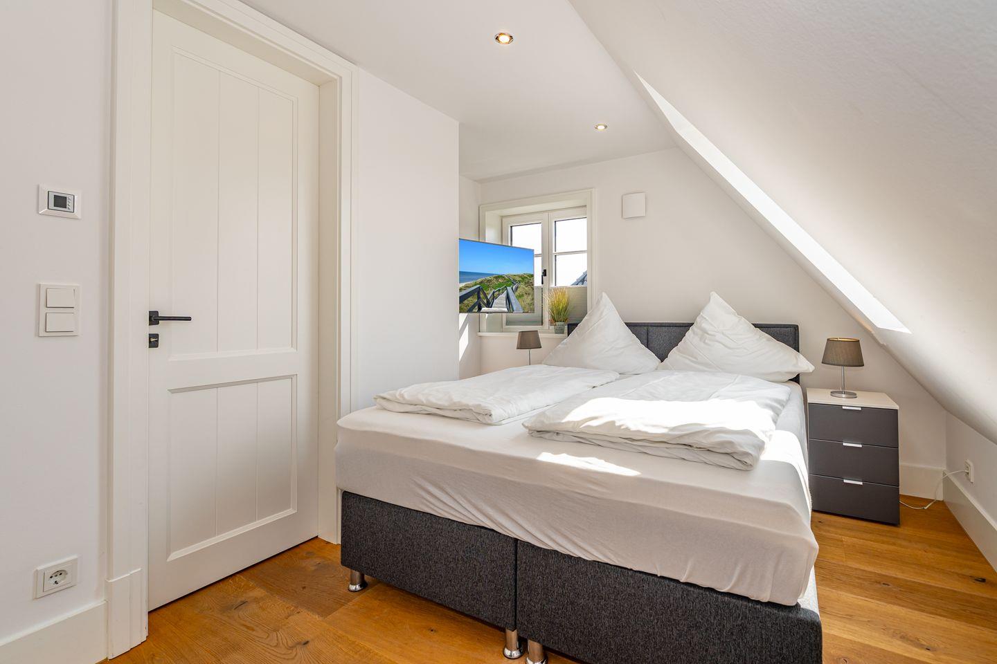 Im Erdgeschoss dieses End-Ferienhausteil befindet sich der helle Wohn- und Essbereich mit einer offenen Küche, ausgestattet mit einem Backofen, Gefrierfach, Nespressokapselmaschine und Wasserkocher. Von hier aus gelangen Sie auf die Terrasse mit dem typischem Sylter Strandkorb (saisonal) und Gartenmöbeln. Nun sind es nur noch ein paar Schritte zu der Blocksauna, die Ihnen in Ihrem Vorgarten zur alleinigen Nutzung zur Verfügung steht. Ebenfalls im Erdgeschoss befindet sich ein Gäste WC. Im Souterrain liegen zwei der drei Schlafzimmer, selbstverständlich mit gemütlich Boxspringbetten und Flat Screen. Außerdem befindet sich auf dieser Ebene ein Badezimmer mit Dusche. Das dritte Schlafzimmer befindet sich, im ersten Obergeschoss. Ebenso das zweite Badezimmer mit Dusche. Ein Parkplatz befindet sich am Ferienhaus.