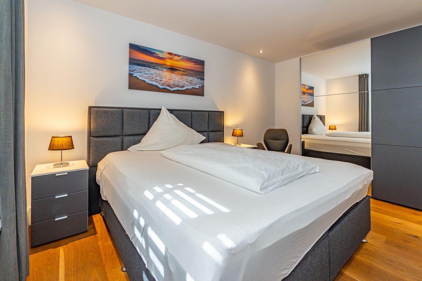 Diese moderne Ferienwohnung bietet auf 100 m² Platz für bis zu sechs Personen und verfügt über drei Schlafzimmer, zwei Badezimmer und eine offene Küche mit Essbereich. Genießen Sie entspannte Stunden auf der großzügigen Terrasse mit Gartenmöbeln.