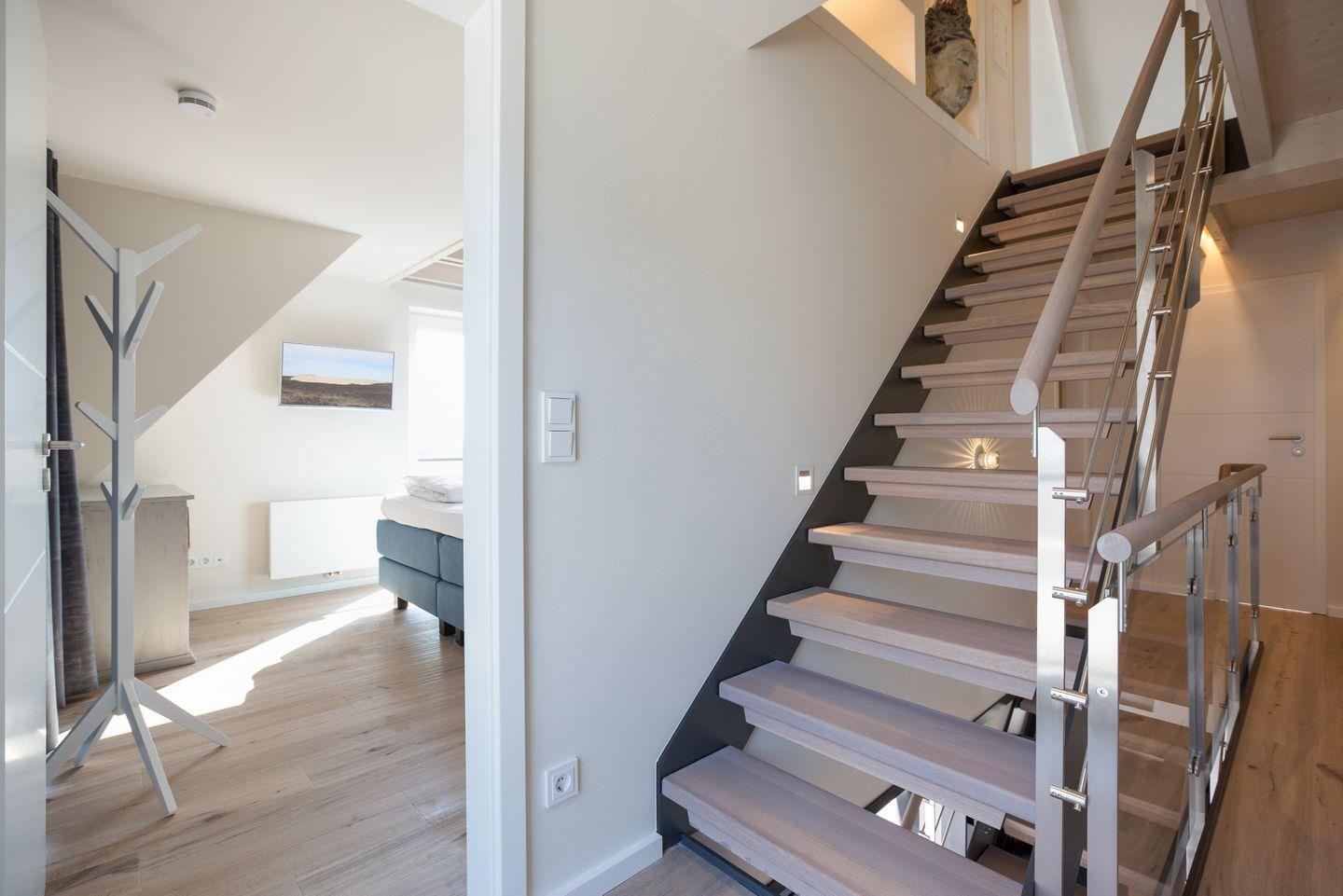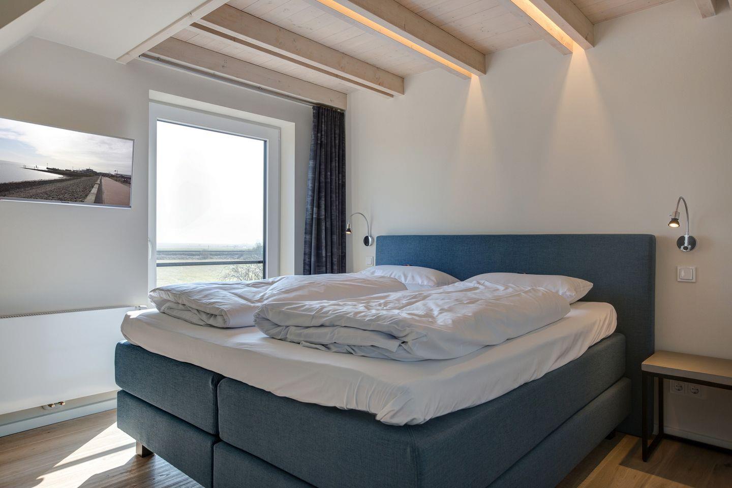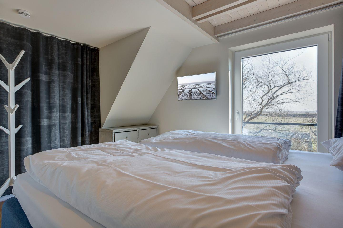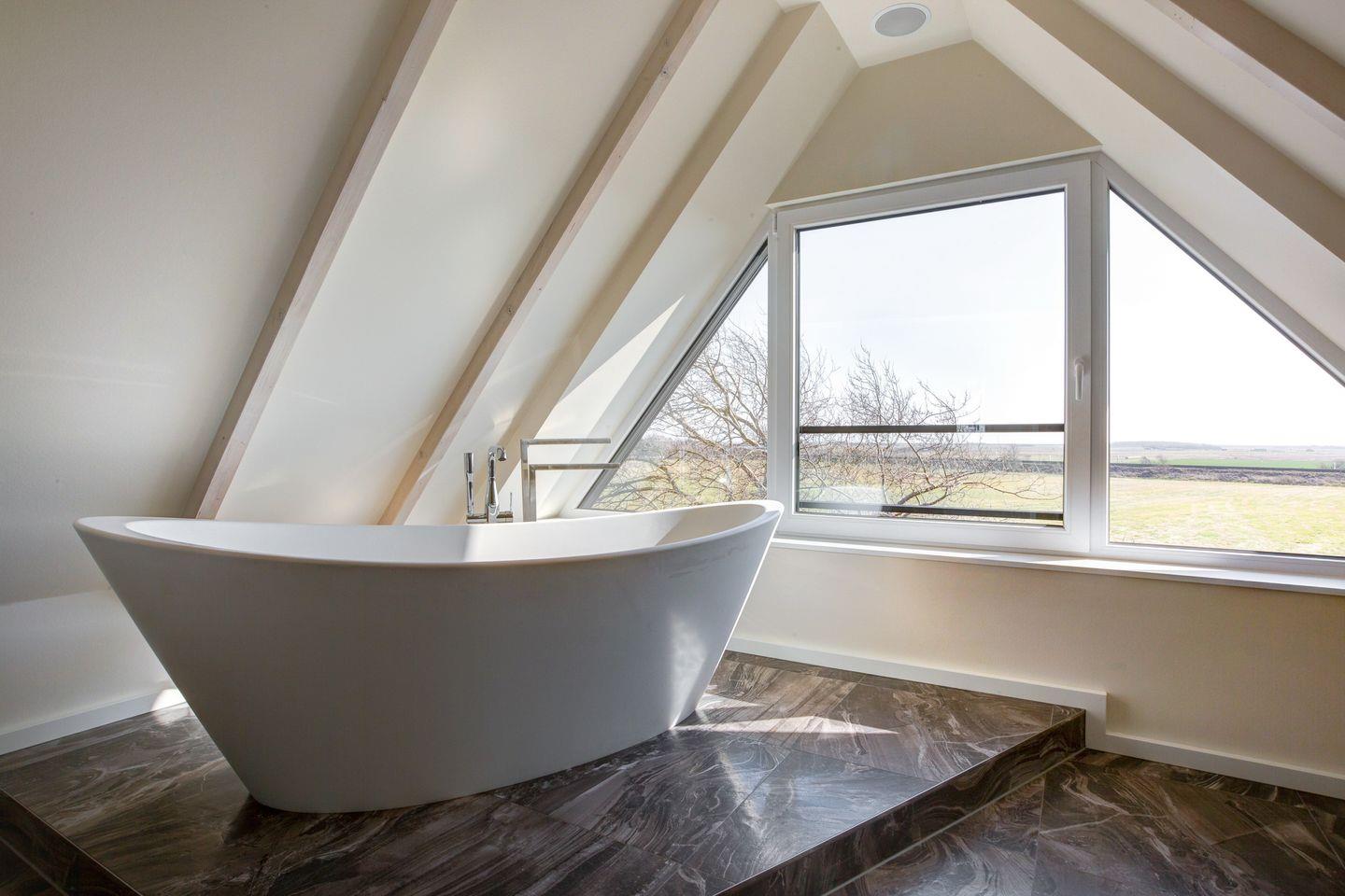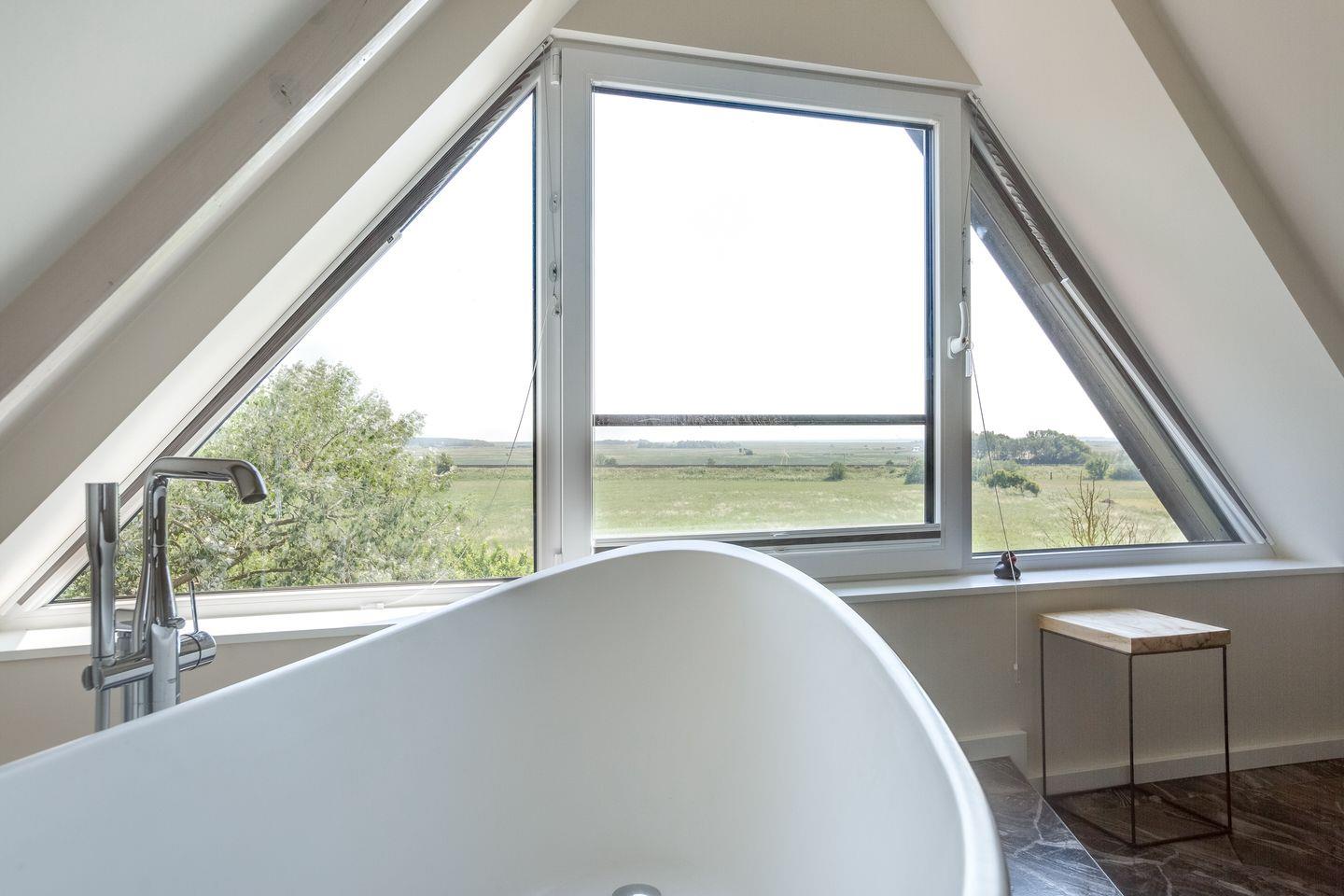 Ganz besonders freuen dürfen Sie sich auf die oberste Etage Ihres Urlaubslogis. Denn hier befindet sich ein außergewöhnlich schönes Bad mit freistehender Wanne, das Ihnen einen einmaligem Blick über Wiesen und Felder bis hin zum Rantumbecken / Deich gewährt.