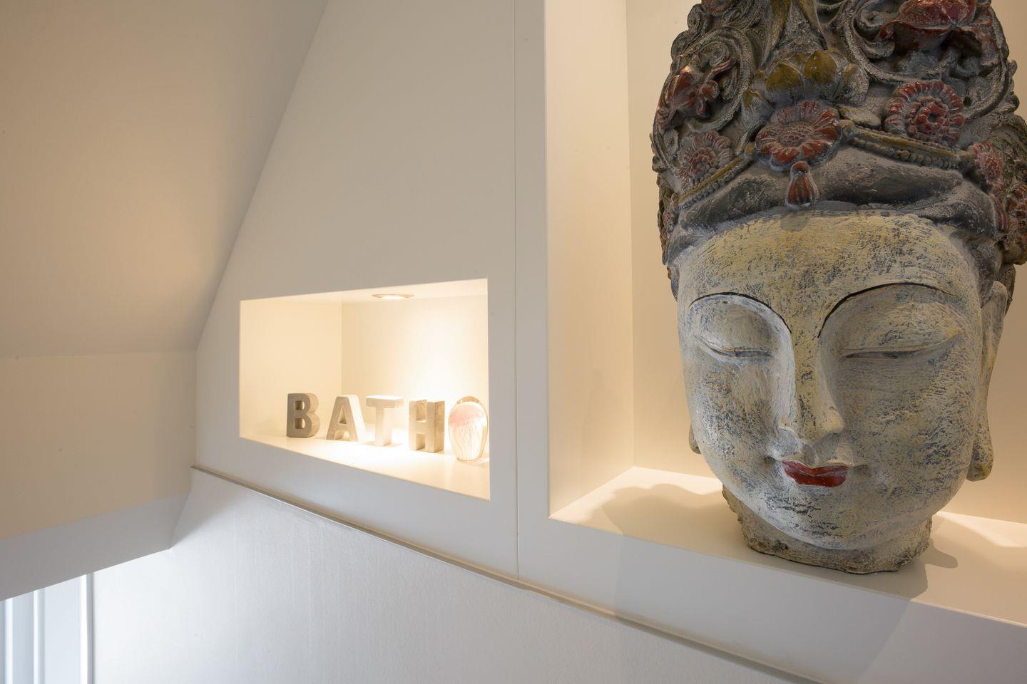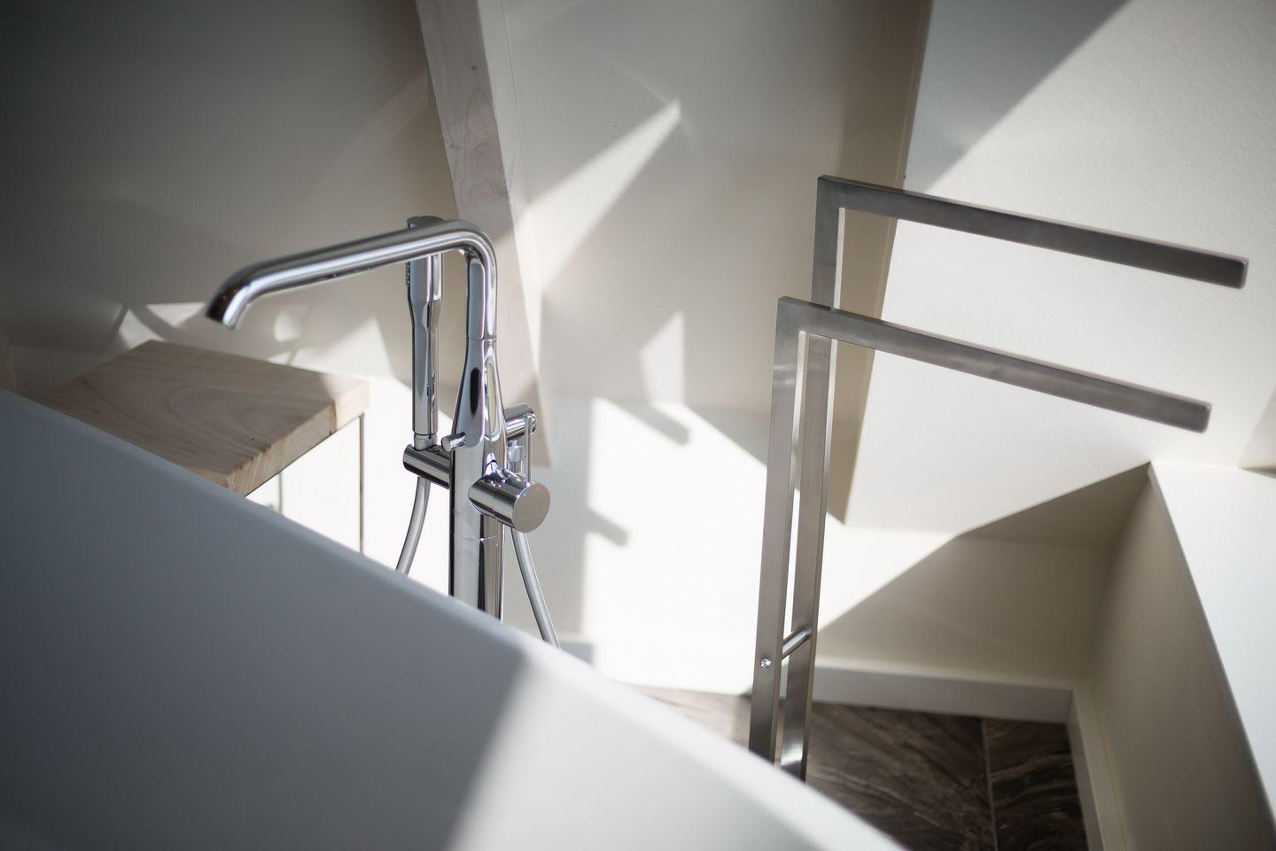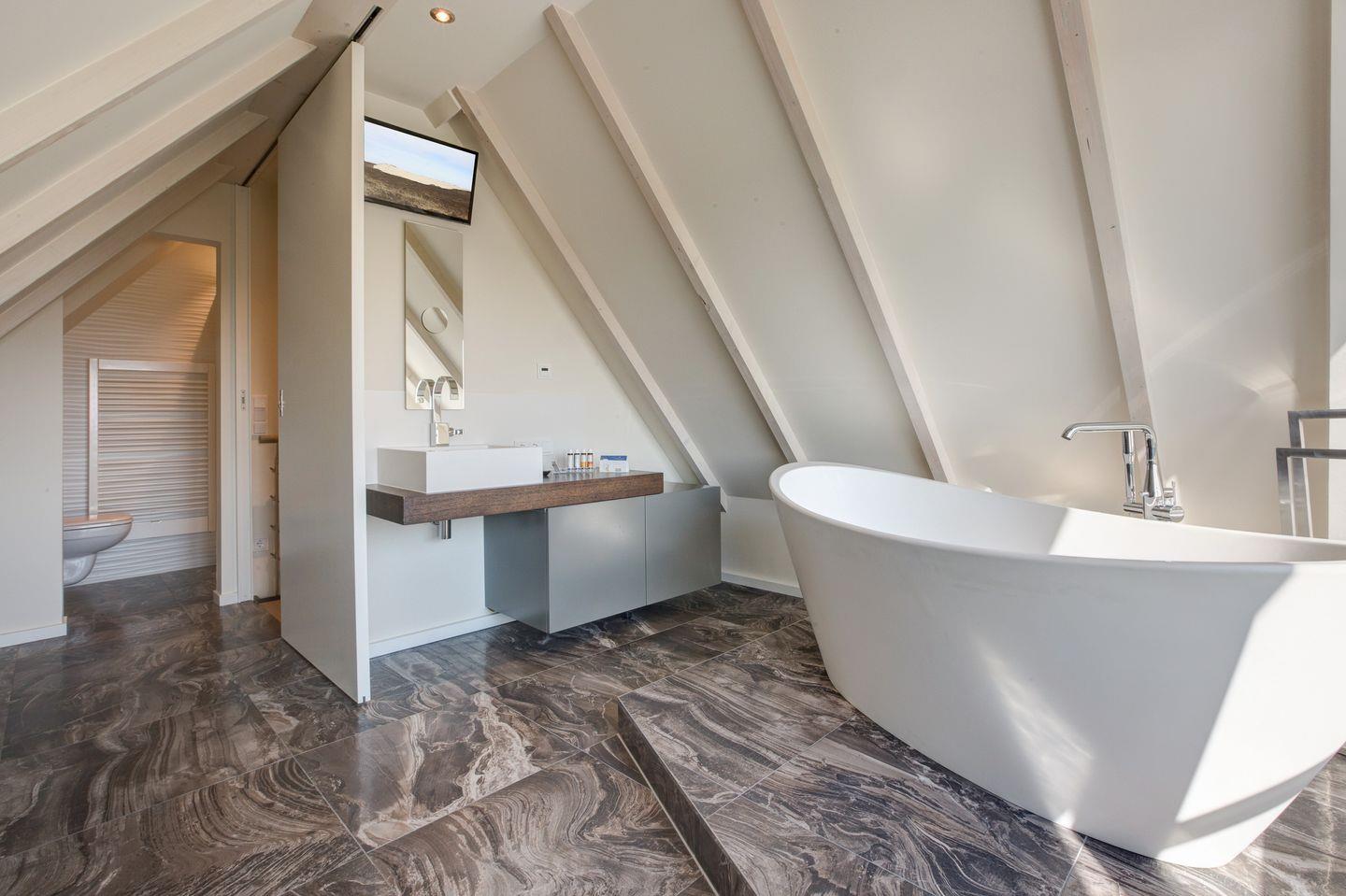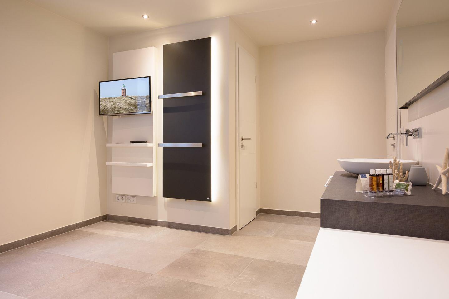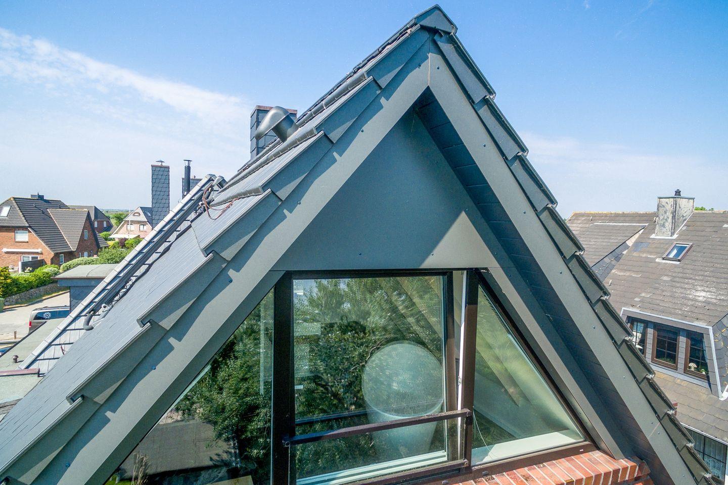 Ganz besonders freuen dürfen Sie sich auf die oberste Etage Ihres Urlaubslogis. Denn hier befindet sich ein außergewöhnlich schönes Bad mit freistehender Wanne, das Ihnen einen einmaligem Blick über Wiesen und Felder bis hin zum Rantumbecken / Deich gewährt.