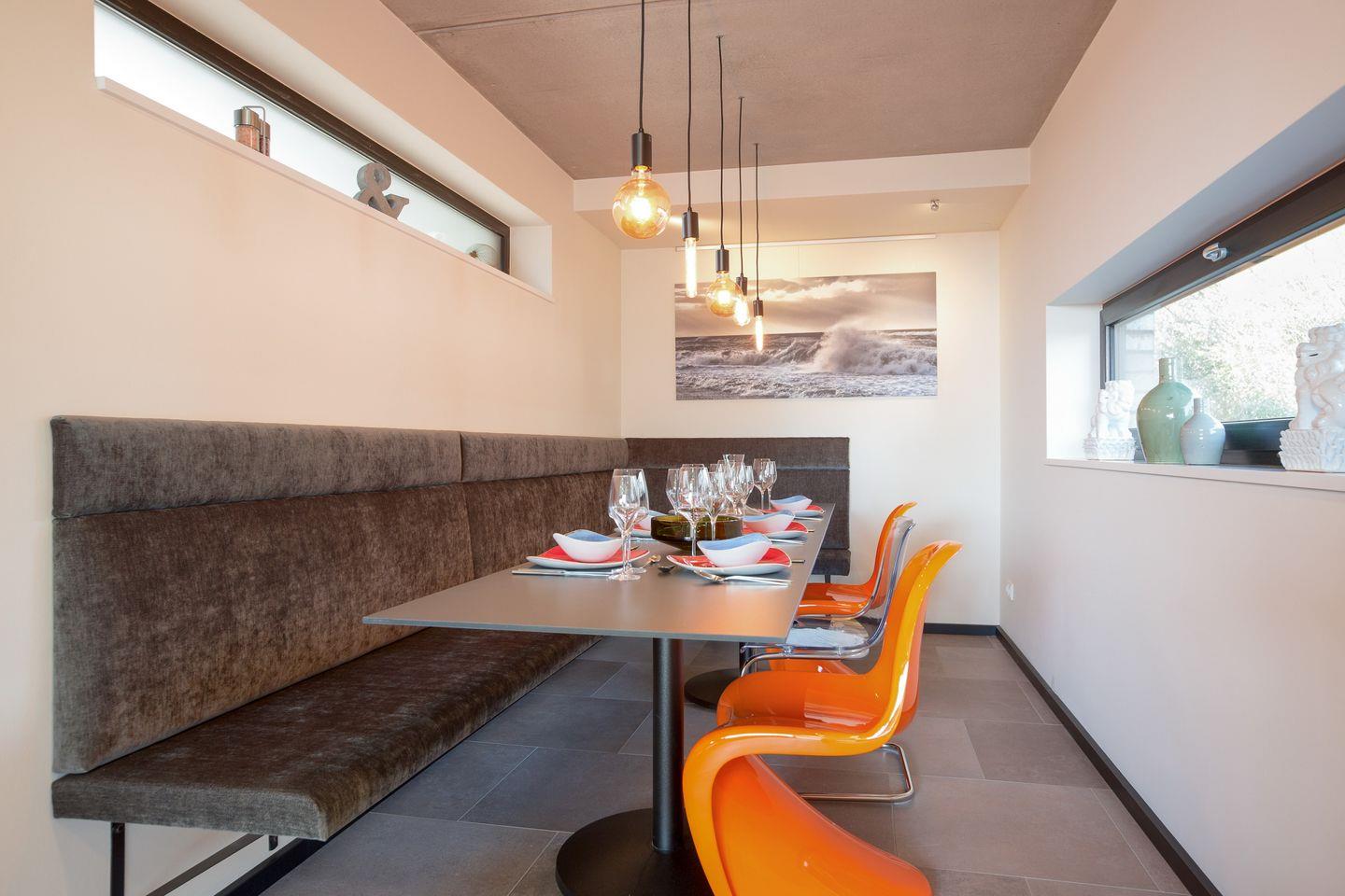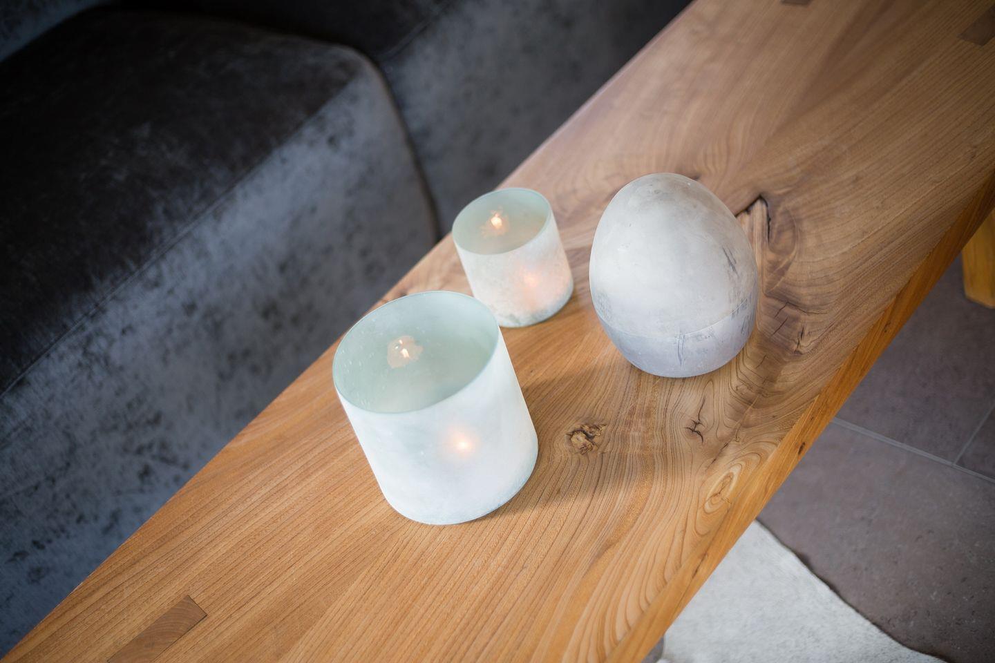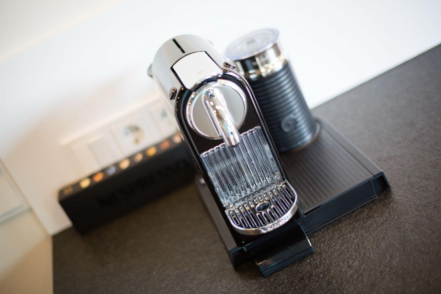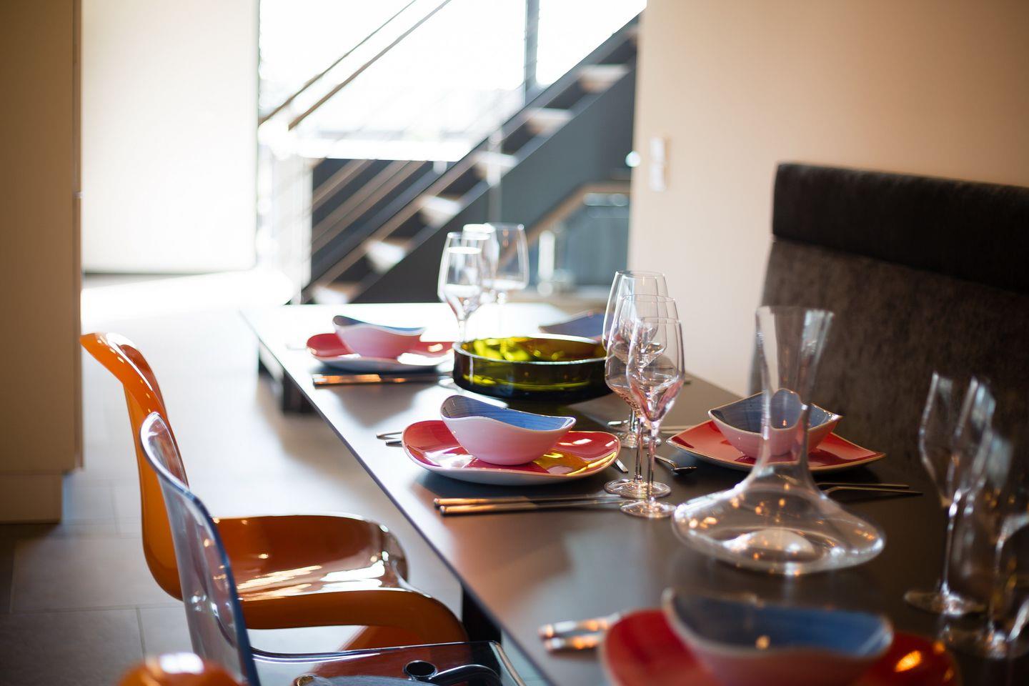 Großzügiger Wohnraum mit Flatscreen-TV. WLAN und eine überkomplette technische Ausstattung verstehen sich von selbst. Ein Kaminofen im Couchbereich lässt Ihren Urlaubstag herrlich entspannt bei einem Glas Rotwein ausklingen. Beeindruckende offene Küche mit zentralem Küchenblock. Hier kann man sich selbst als ambitionierterer Hobbykoch nach Herzenslust austoben und feine Menues zaubern. Espressomaschine, Weinschrank, Induktionsherd sowie Geschirrspülmaschine runden die überkomplette Küchenausstattungen ab. Die große Esstafel mit den legendären VITRA Pantone-Chairs bietet auch für die ganz große Runde Platz.