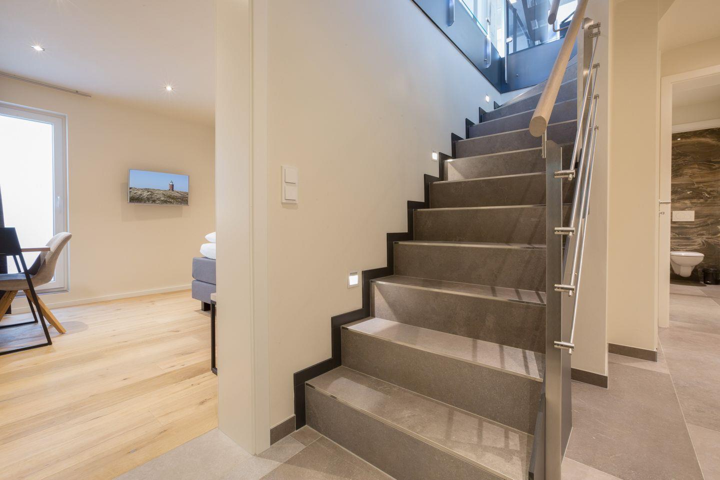 In Ihrem Long Beach House ist bestes Design zu Hause. Hier ist nichts von der Stange, alles ist besonders und in jedem Winkel gibt es etwas Außergewöhnliches zu entdecken. Sichtbetonwände. Design-Mobiliar. Abgefahrene Luxusküche, die selbst Profis aufhorchen lässt. Freistehende Badewanne mit Endlos-Blick über die Tinnumer Wiesen (oder wahlweise mit Endlosprogramm über Ihren eigenen Bad-TV). Große Design-Sauna und auch hier müssen Sie bei Bedarf nicht auf Ihr TV-Erlebnis während des Saunagangs verzichten. Heimeliger Kamin für gesellige und kuschelige Sylter-Stunden im Wohnbereich. High-End Beleuchtungskonzept und Design-Leuchten. Feinste Fliesenarbeiten und Natursteine im XXL-Format konkurrieren mit der edlen Eichendielung. Stylishe Terrasse mit Blickrichtung Wiesen, Hindenburgdamm und Deich. ... Diese Liste ließe sich beliebig ausführen, jedoch ist Ihr Long Beach House zu groß und vielfältig, dass hier alles an Highlights aufgezählt werden kann.