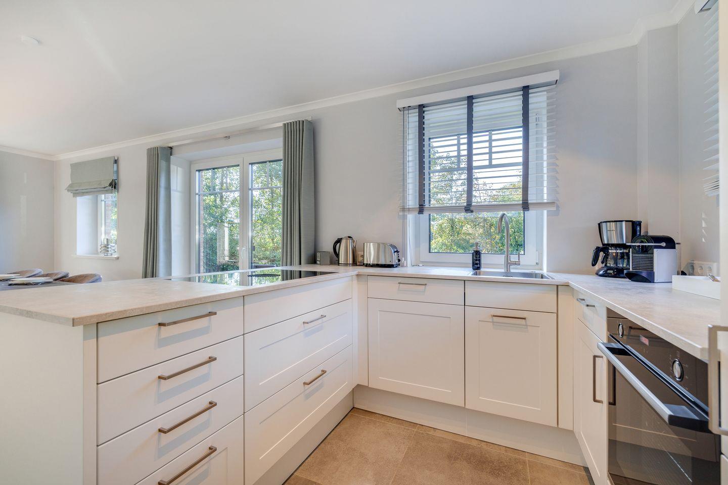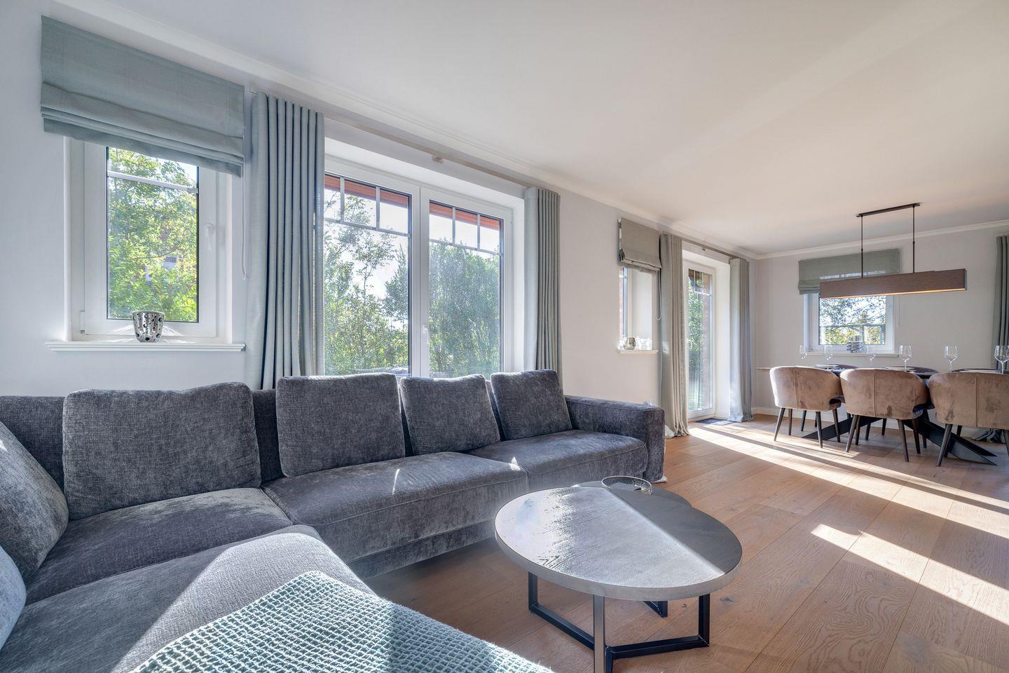 Der Wohnraum des Hauses bietet Ihnen eine große Couchecke mit Flatscreen-TV und bodentiefen Fenstern, die die Sylter Sonne hereinscheinen lassen. Am Esstisch finden bis zu sechs Personen Platz und die Küche ist mit Induktionskochfeld, Backofen, Geschirrspülmaschine und Nespresso-Maschine top-ausgestattet. Vom Wohn-/Essbereich aus erreichen Sie Ihren privaten Garten mit zwei möblierten Terrassen (April bis Oktober). Auf gleicher Ebene zum Wohnraum finden Sie außerdem ein Gäste-WC.