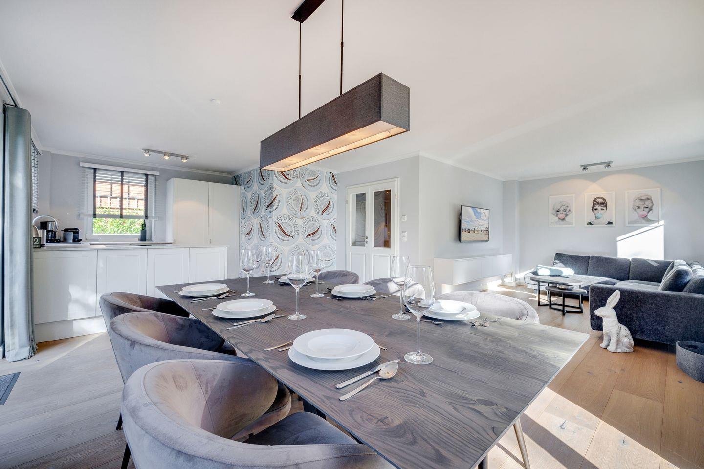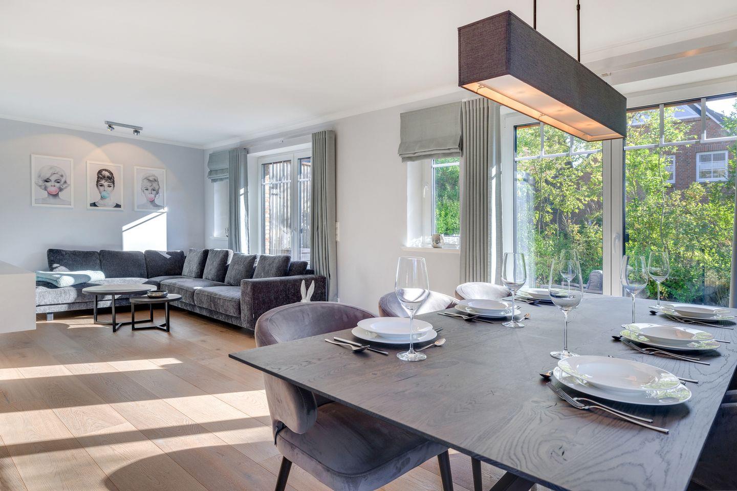 EG: Wohnraum mit Flatscreen-TV, W-Lan, Essbereich, offene Küche mit Backofen, Induktionsherd, Geschirrspülmaschine, Nespressomaschine, Gäste-WC, Garten und Terrasse mit Gartenmöbeln
