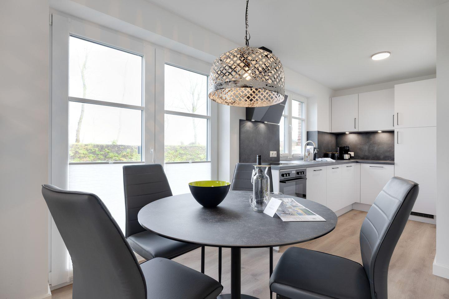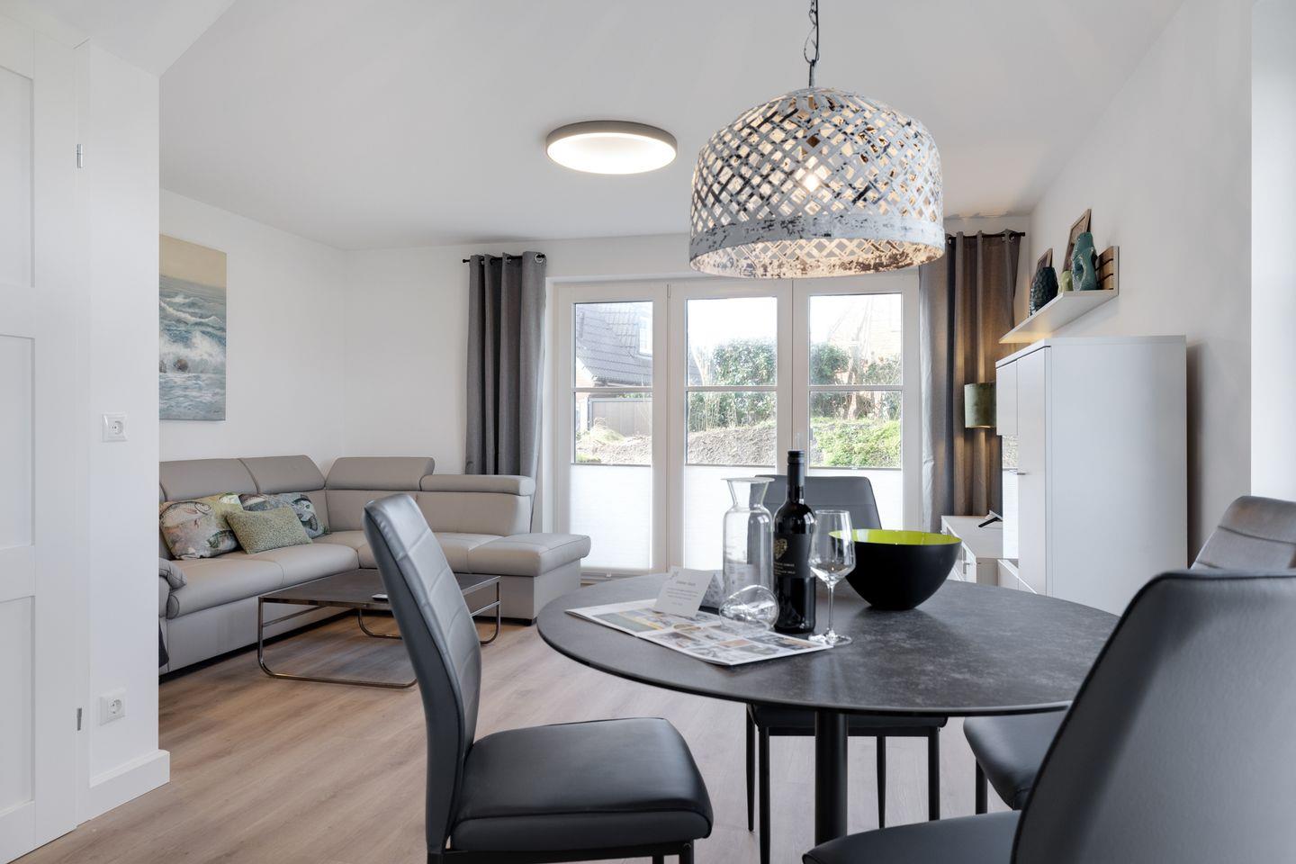 Das Hausteil erstreckt sich über großzügige 90 m² und bietet eine harmonische Mischung aus modernem Komfort und heimeliger Atmosphäre. Auf einer Ebene finden Sie zwei stilvoll eingerichtete Schlafzimmer, die einen erholsamen Schlaf garantieren. Die offene Küche ist voll ausgestattet mit hochwertigen Geräten, darunter ein Kühlschrank, ein Backofen, eine Mikrowelle und ein Geschirrspüler – perfekt für die Zubereitung Ihrer Lieblingsmahlzeiten. Der angrenzende Esstisch im Wohnbereich lädt zu geselligen Abendessen ein.