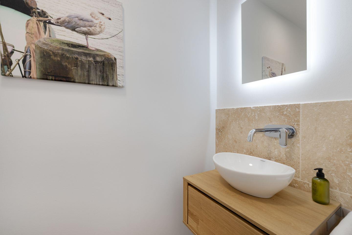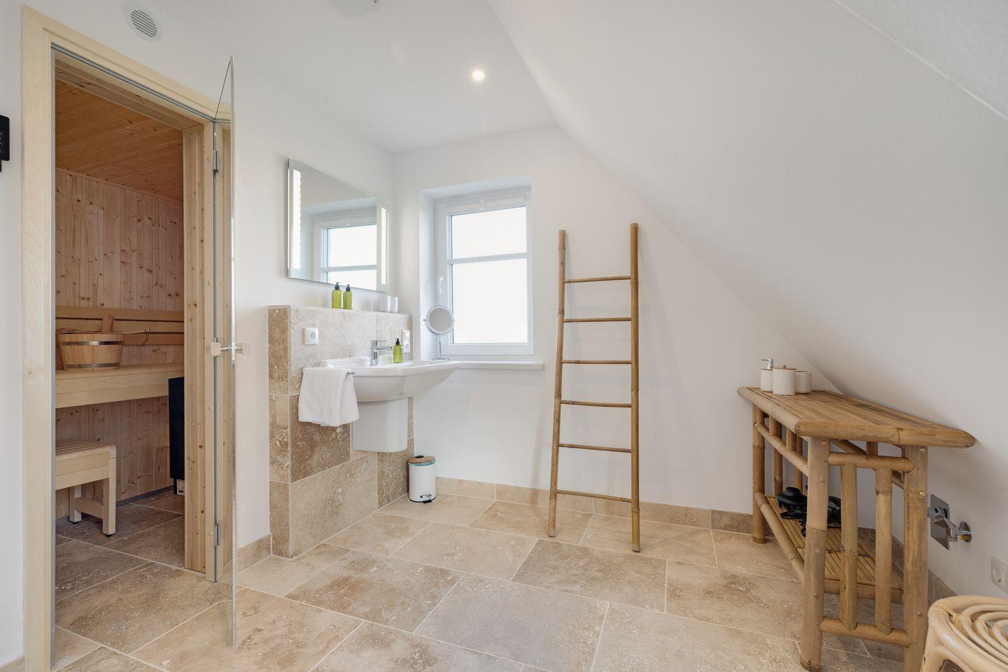 Ein Highlight dieser Unterkunft ist die eigene Sauna, die zur Eigennutzung bereitsteht. Nach einem Tag voller Erkundungen und Aktivitäten auf der Insel können Sie hier wunderbar entspannen und neue Kräfte tanken. Das Ferienhaus ist zudem mit einem modernen Badezimmer ausgestattet, das über eine Dusche und eine umfangreiche Badausstattung verfügt. Für zusätzlichen Komfort sorgt ein Gäste-WC.