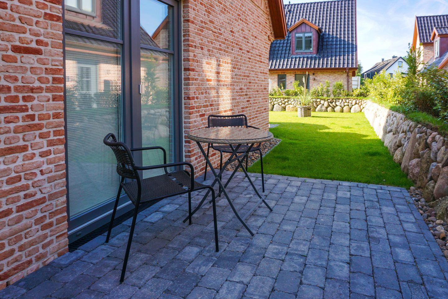 Das Hausteil verfügt über zwei komfortable Schlafzimmer, die mit hochwertigen Betten und viel Licht ausgestattet sind, sodass Sie nach einem erlebnisreichen Tag auf Sylt erholsam schlafen können. Der offene Wohnbereich lädt zum Entspannen ein und ist mit einem gemütlichen Sofa, einem Esstisch und modernster Unterhaltungstechnik, einschließlich zwei Fernseher, ausgestattet. Die große Terrasse mit Gartenmöbeln ist ideal, um die frische Luft und den Blick ins Grüne zu genießen.