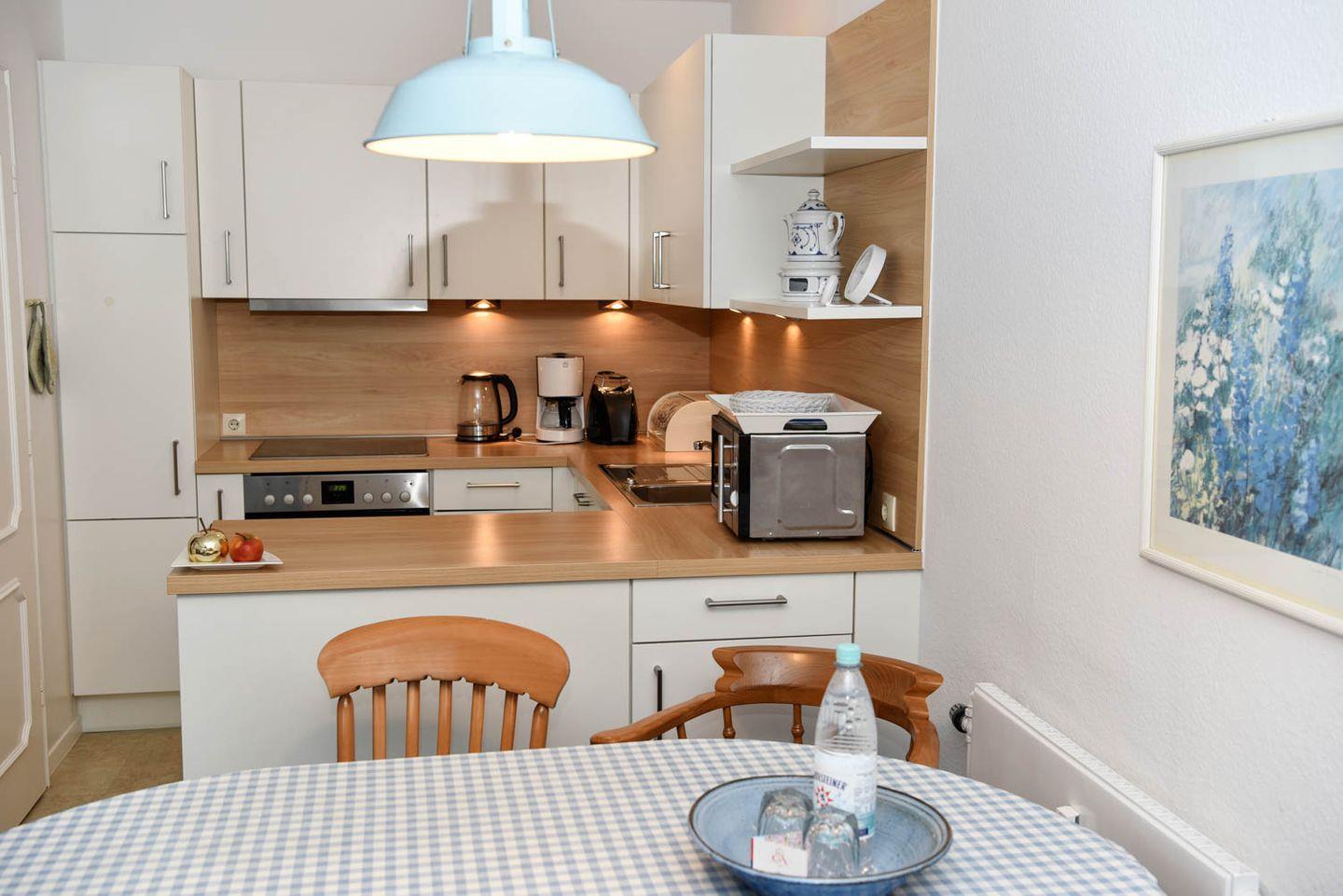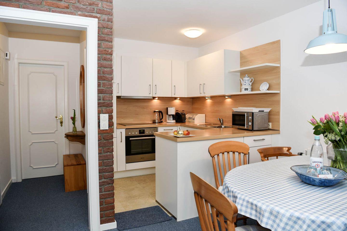 Moin Moin und Willkommen in der charmanten 3-Zimmer-Ferienwohnung Carina. Dieses in frischem Friesisch-Weiß-Blau gehaltene Maisonette-Domizil hat einen großzügigen Wohn-, Koch- und Essbereich und vor Kurzem eine neue Einbauküche erhalten. "Carina" erstreckt sich über zwei Ebenen und liegt im ersten Stock eines Hauses, ein möblierter Südbalkon gehört dazu, die Straße ist ruhig, der Strand von hier aus nicht weit entfernt.