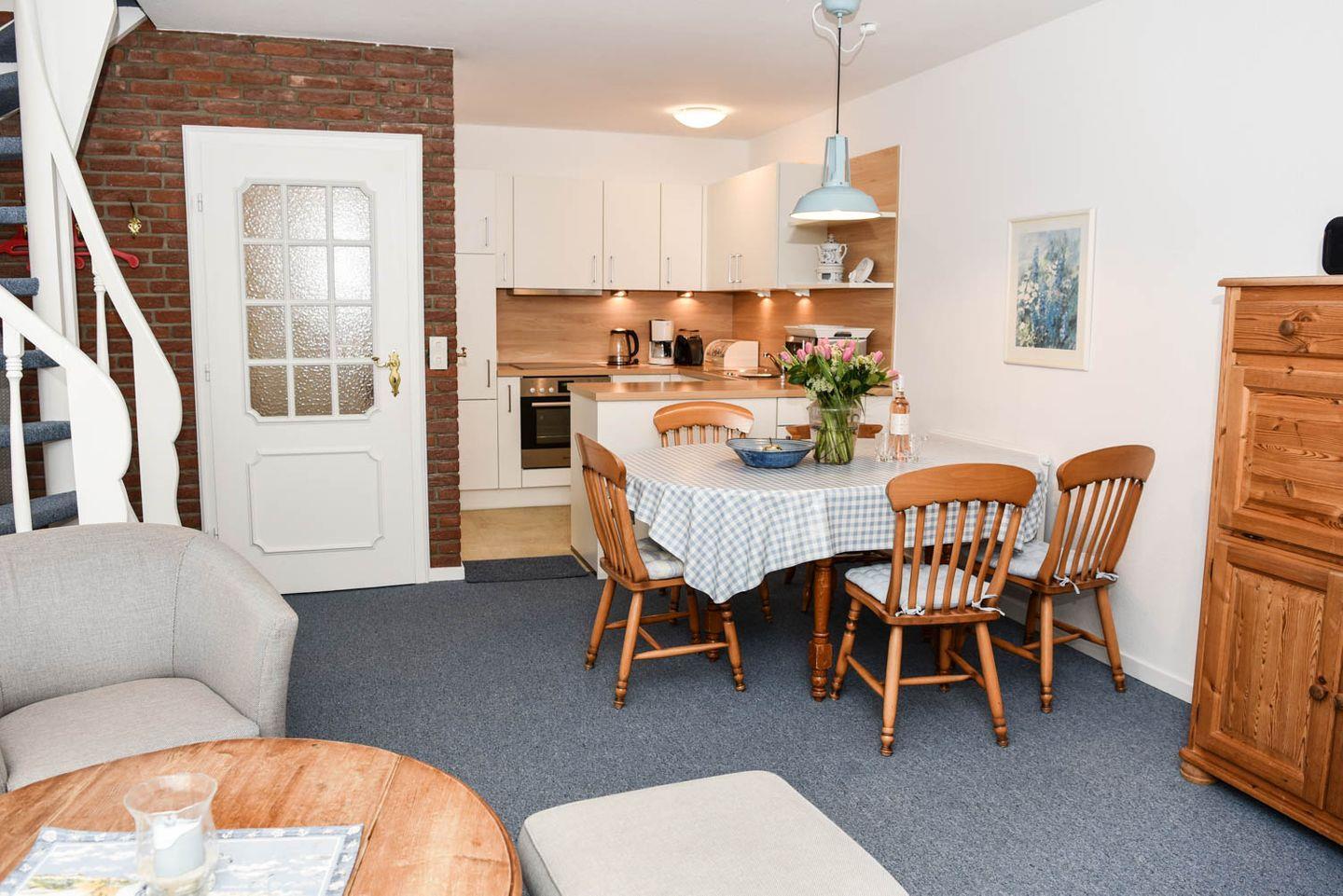 Moin Moin und Willkommen in der charmanten 3-Zimmer-Ferienwohnung "Carina". Dieses in frischem Friesisch-Weiß-Blau gehaltene Maisonette-Domizil hat einen großzügigen Wohn-, Koch- und Essbereich und vor Kurzem eine neue Einbauküche erhalten. "Carina " erstreckt sich über zwei Ebenen und liegt im ersten Stock eines Hauses, ein möblierter Südbalkon gehört dazu, die Straße ist ruhig, der Strand von hier aus nicht weit entfernt.